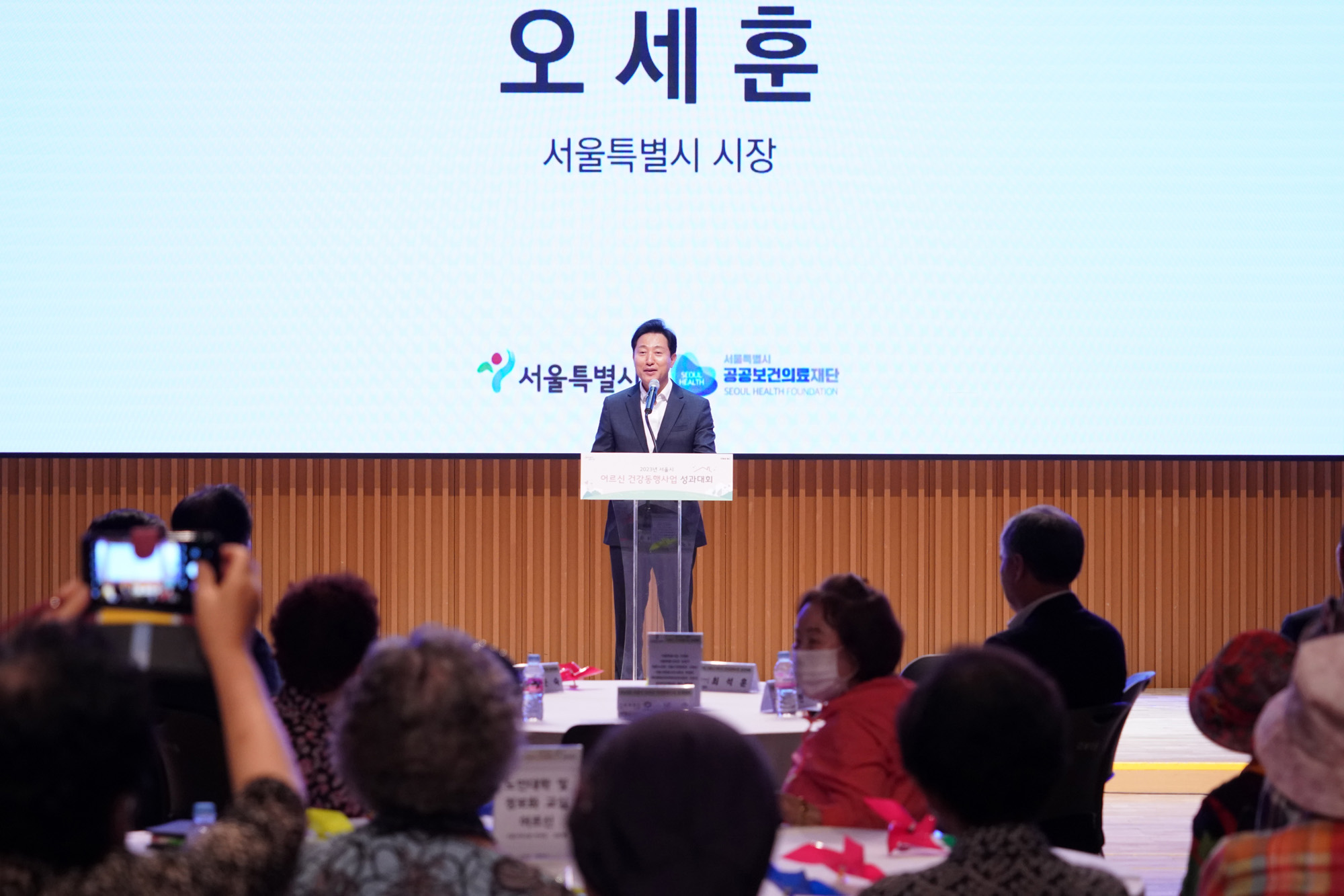 오세훈 서울시장(왼쪽 두 번째), 김현기 서울특별시의장 등 참석자들이 12일 오전 서울 중구 서울시청에서 열린 어르신 건강동행사업 성과대회에서 희망동행 퍼포먼스를 하고 있다. 서울시 제공