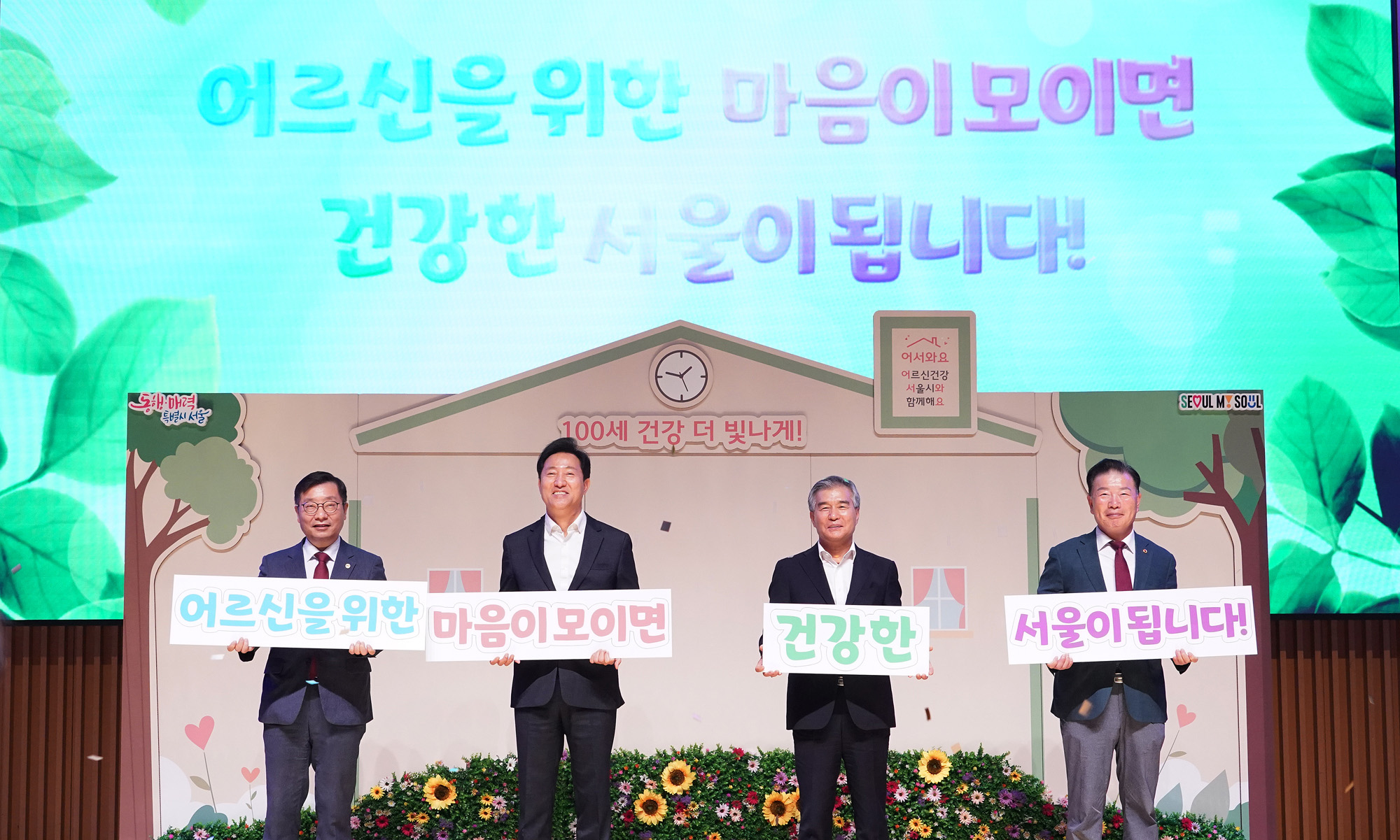 오세훈 서울시장(왼쪽 두 번째), 김현기 서울특별시의장 등 참석자들이 12일 오전 서울 중구 서울시청에서 열린 어르신 건강동행사업 성과대회에서 희망동행 퍼포먼스를 하고 있다. 서울시 제공