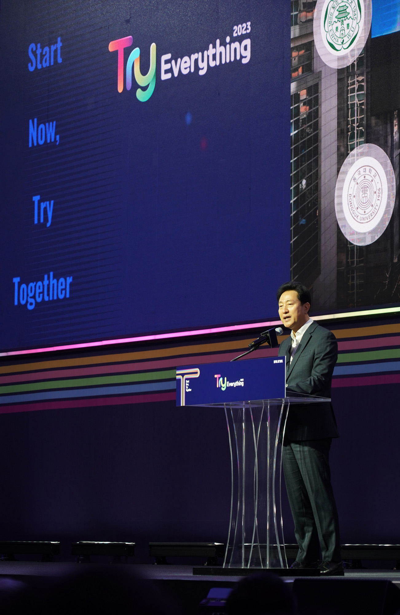 오세훈 서울시장이 13일 서울 동대문디자인플라자(DDP) 아트홀에서 열린 글로벌 스타트업 대축제 '트라이 에브리싱(Try Everything) 2023'에서 개회사를 하고 있다. 서울시 제공