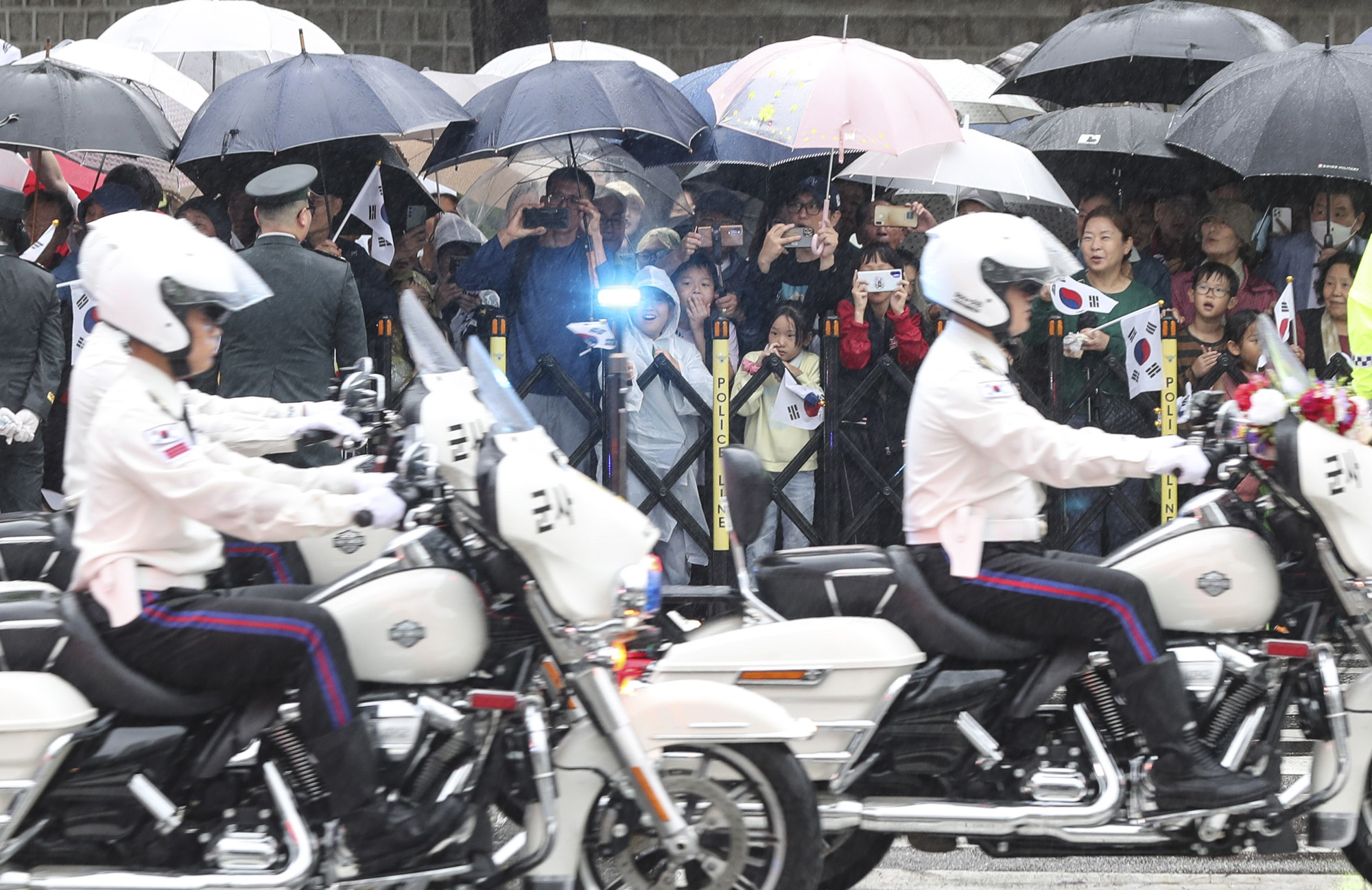 건군 75주년 국군의 날 기념행사가 26일 오후 서울 중구 세종대로 일대에서 진행되는 가운데 시민들이 시가행진하는 국군 장병들을 향해 태극기를 흔들고 있다. 2023.09.26 사진공동취재단