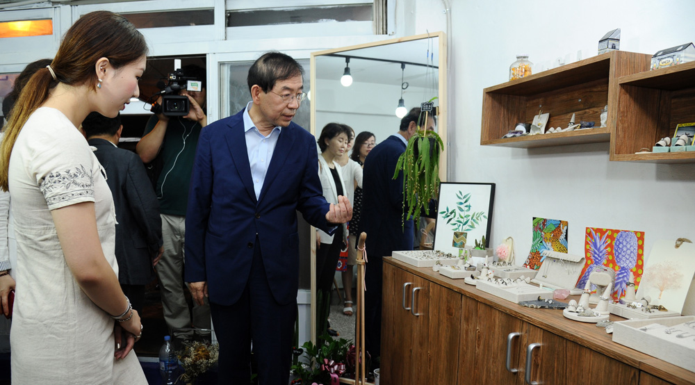 25일 서울 용산구 해방촌 도시재생지원센터에서 '해방촌 도시재생활성화를 위한 공동협력 협약식' 후 박원순 서울시장, 한태식 동국대 총장 및 서울시 관계자들이 기념사진을 촬영하고 있다. 서울시 제공