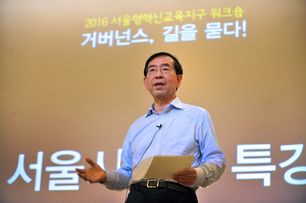 박원순 서울시장은 26일 용인 한화리조트에서 열리는 '서울형혁신교육지구 하계 워크숍'에 참가해 발언하고 있다. 서울시 제공