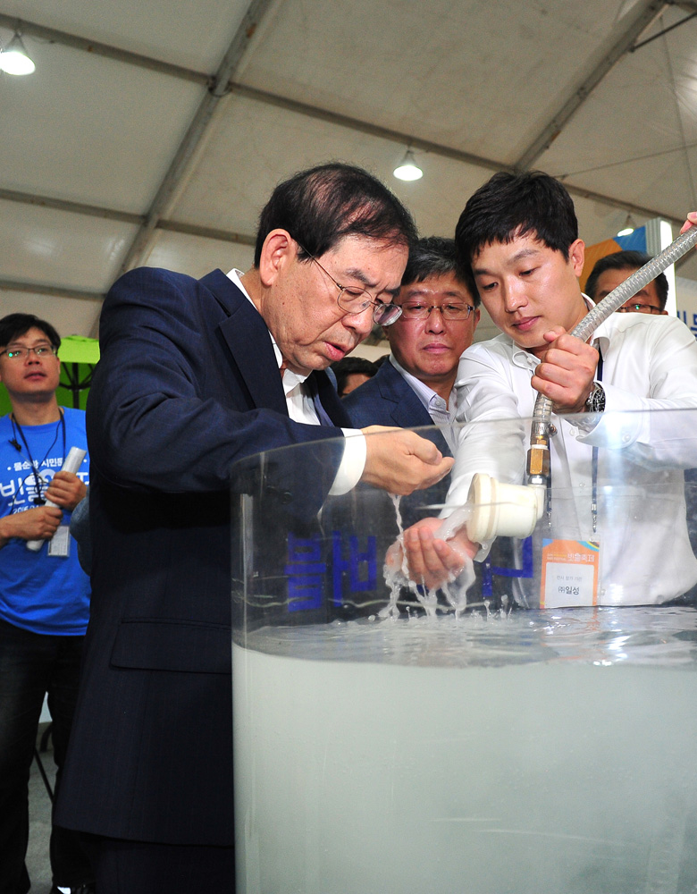 박원순 서울시장이 28일 오후 서울광장에서 열린 '시민과 함께하는 물순환 시민문화제'에 참석해 박람회장을 둘러보고 있다. 서울시 제공