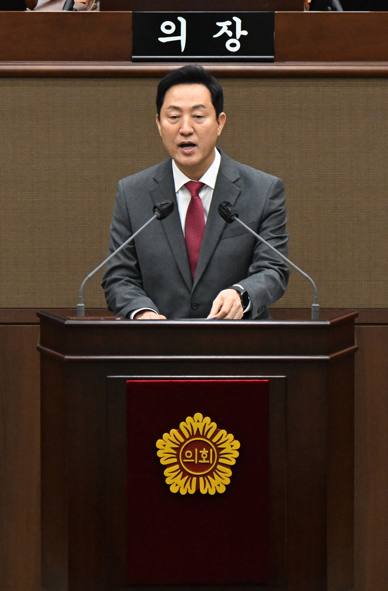 오세훈 서울시장이 20일 오후 서울 중구 서울특별시의회 본관에서 열린 제322회 시의회 임시회 제1차 본회의에 출석해 2024년도 주요 업무 보고를 하고 있다. 서울시 제공