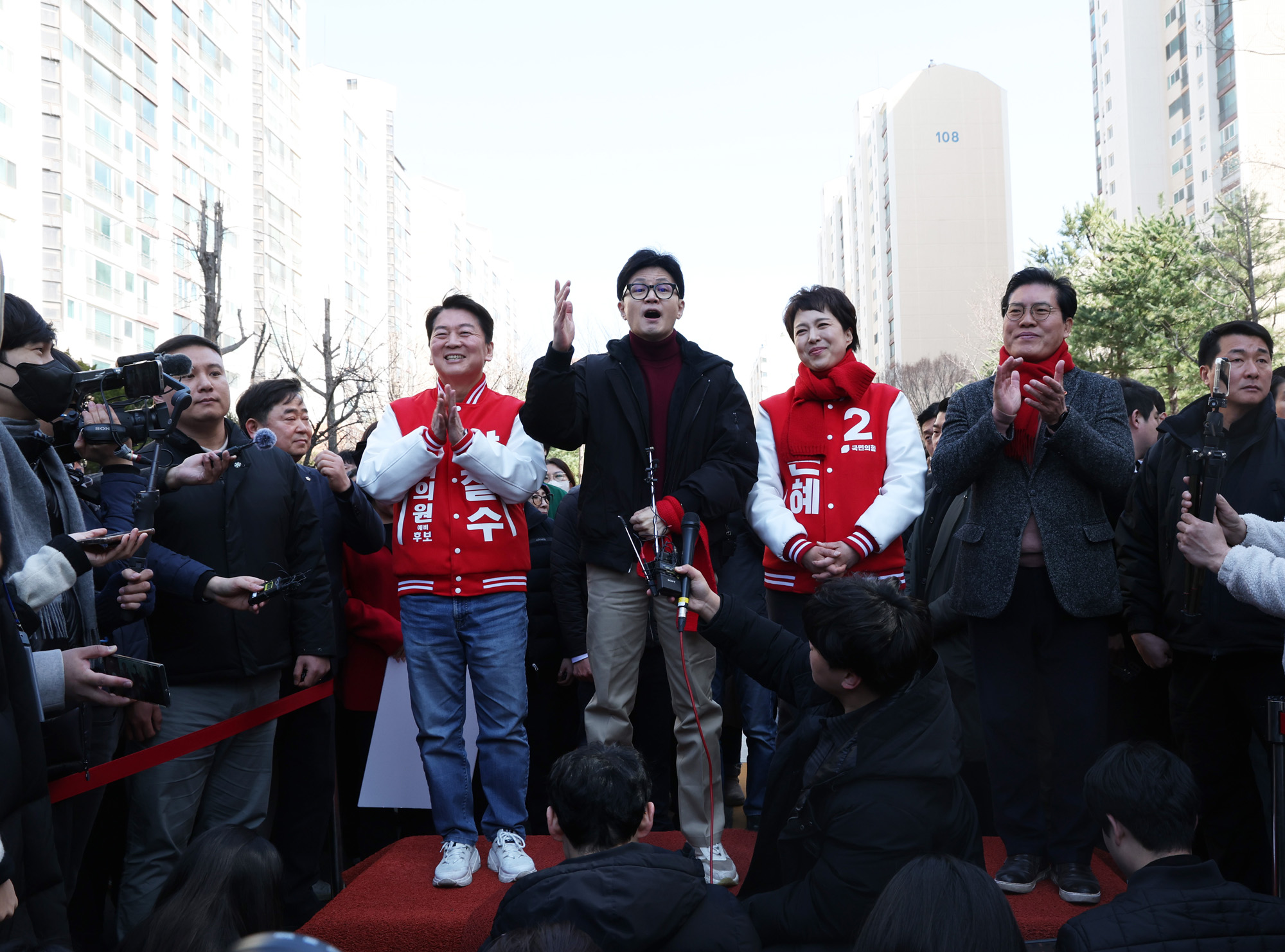 한동훈 국민의힘 비상대책위원장과 안철수, 김은혜 국회의원 후보가 8일 오전 재건축 추진 아파트단지인 경기 성남시 양지금호1단지아파트를 방문해 시민들과 인사하고 있다. 2024.03.08
