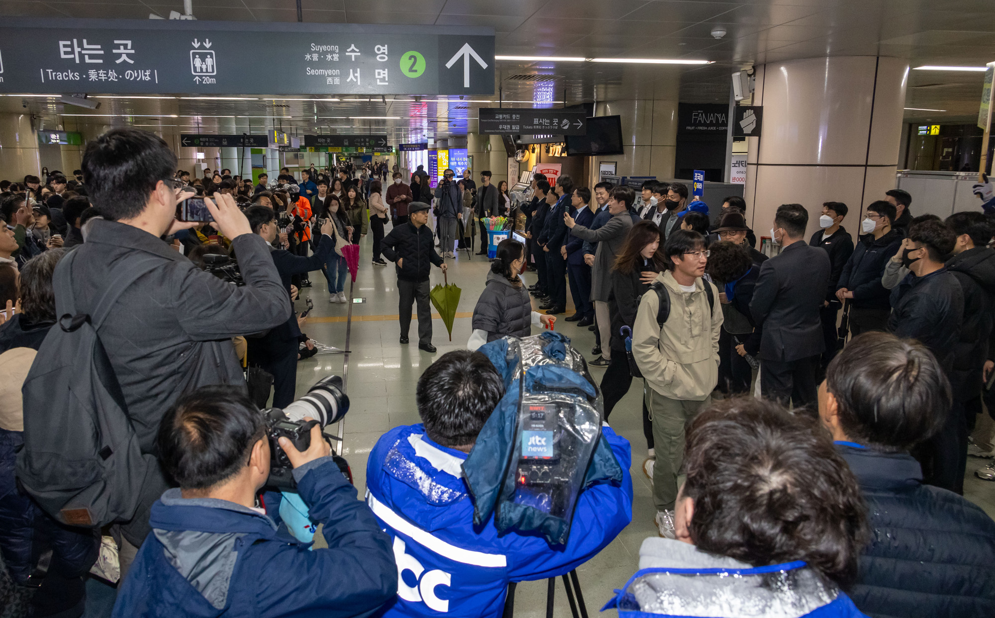 28일 오전 조국혁신당의 조국대표를 비롯한 주요 후보들이 부산 센텀시티역에서 시민들에게 출근인사를 하고 있다. 2024.03.28.