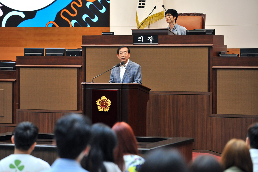 21일 서울시의회 본회의장에서 박원순 서울시장이 서울시 청년정책 수립과 실행에 참여하는 협치기구인 ‘서울청년의회’ 의원들 앞에서 발언을하고 있다. 서울시 제공