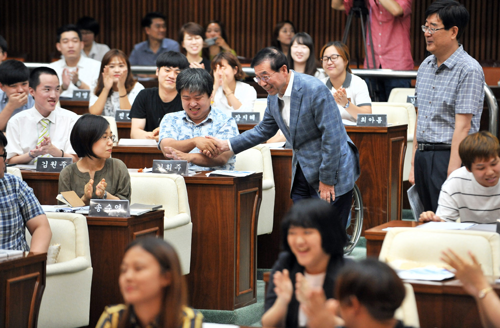 21일 서울시의회 본회의장에서 박원순 서울시장이 서울시 청년정책 수립과 실행에 참여하는 협치기구인 ‘서울청년의회’ 의원들 앞에서 발언을하고 있다. 서울시 제공