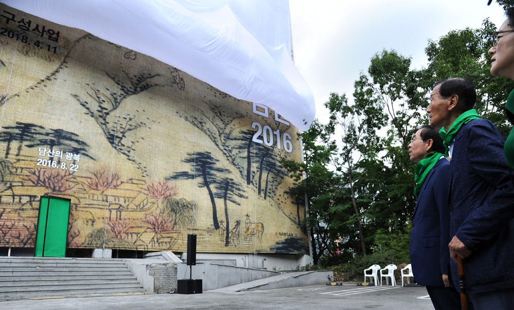 22일 서울 예장동 남산 옛 통감관저 터 및 옛 TBS교통방송 부지 일대에서 열린 '남산 예장자락 재생사업' 착공식에서 박원순 시장(앞줄 왼쪽 세번째) 등 참석자들이 걸어가고 있다. 서울시 제공