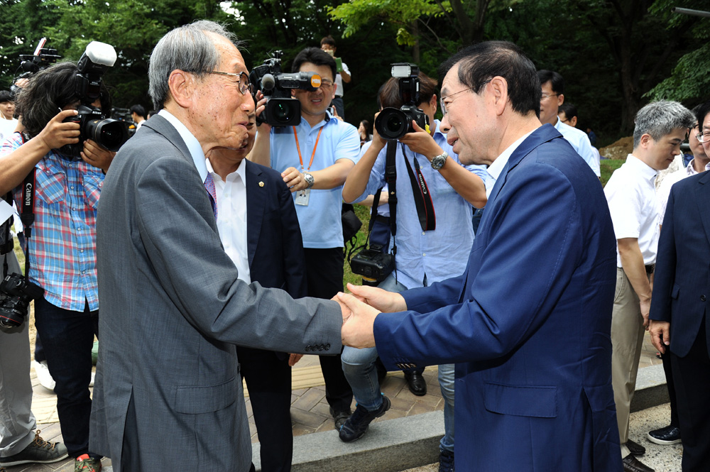 22일 서울 예장동 남산 옛 통감관저 터 및 옛 TBS교통방송 부지 일대에서 열린 '남산 예장자락 재생사업' 착공식에서 박원순 시장(앞줄 왼쪽 세번째) 등 참석자들이 걸어가고 있다. 서울시 제공
