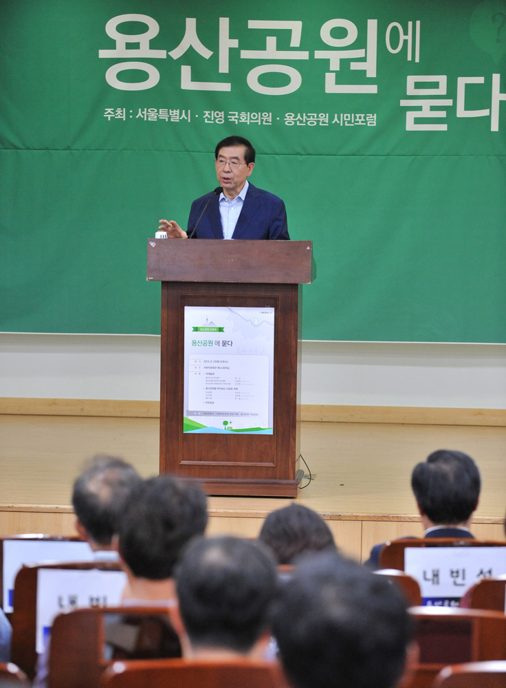 박원순 서울시장은 23일 오후 2시 국회 의원회관 제2소회의실에서 서울시와 진영 국회의원, 용산공원 시민포럼이 공동으로 주최한 '용산공원 토론회' 참석했다. 서울시 제공