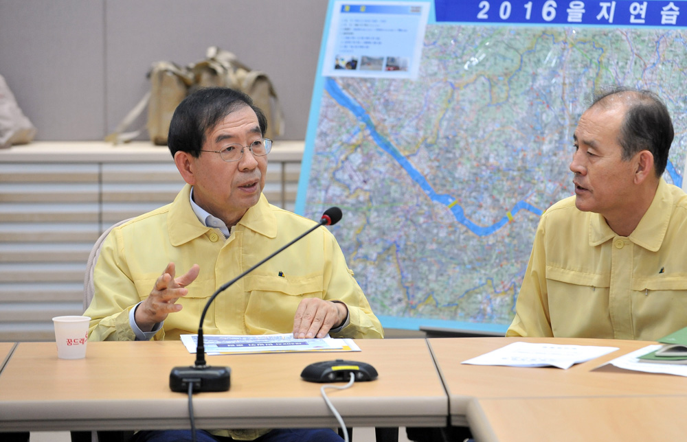 박원순 시장은 을지연습(8.22~25) 기간이자 ‘제402차 민방위의 날’인 24일(수) 14시부터 20분간 실시된 시청사 민방공 대피훈련을 지하 3층 충무기밀실에서 총괄하고, 비상 시 시민안전보호태세를 점검했다. 서울시 제공
