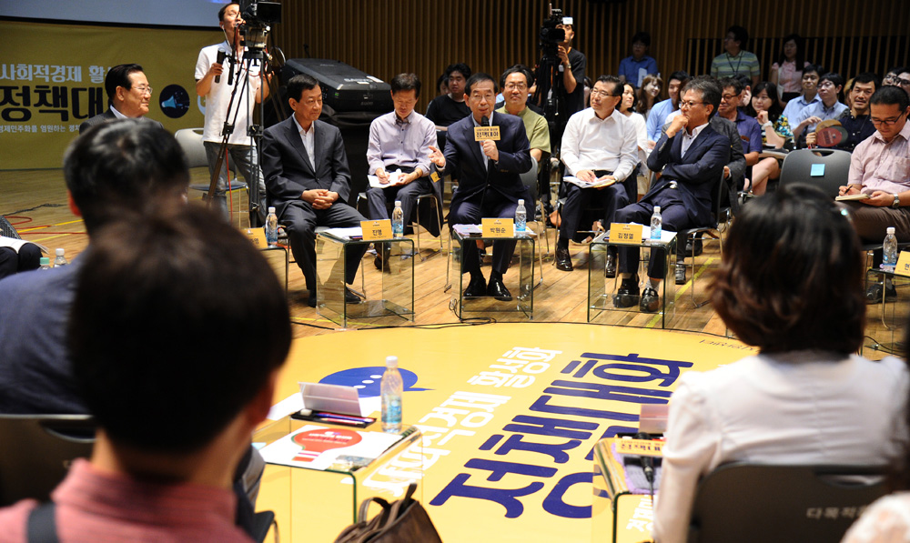 25일 오전 서울 중구 서울시청 다목적홀에서 열린 '사회적경제 활성화 정책대화'에서 박원순 서울시장을 비롯한 참석자들이 이은애 서울시 사회적경제지원센터장의 성과 발표를 경청하고 있다. 서울시 제공
