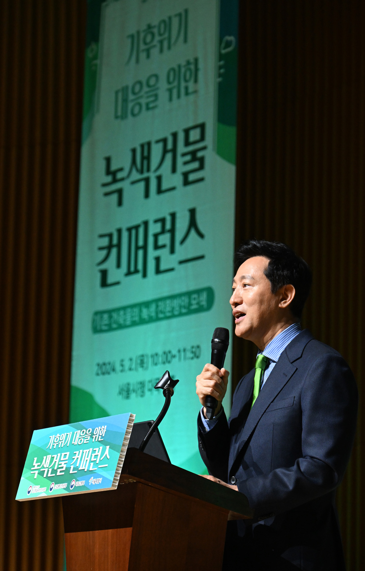 | 사진설명 | 오세훈 서울시장이 2일 오전 서울 중구 서울시청 다목적홀에서 열린 기후위기 대응을 위한 녹색건물 컨퍼런스에 참석하고 있다. 이번 컨퍼런스는 2050탄소중립녹색성장위원회와 건물 탄소중립 정책 핵심 부처인 산업통상자원부, 국토교통부, 건물 탈탄소화에 선도적으로 앞장서고 있는 서울시 등 4개 기관이 건물 온실가스 감축 상호·협력을 약속하는 업무협약 체결하고, 25개 구청장과 함께 건물 에너지효율 혁신을 다짐했다. 서울시 제공 |
