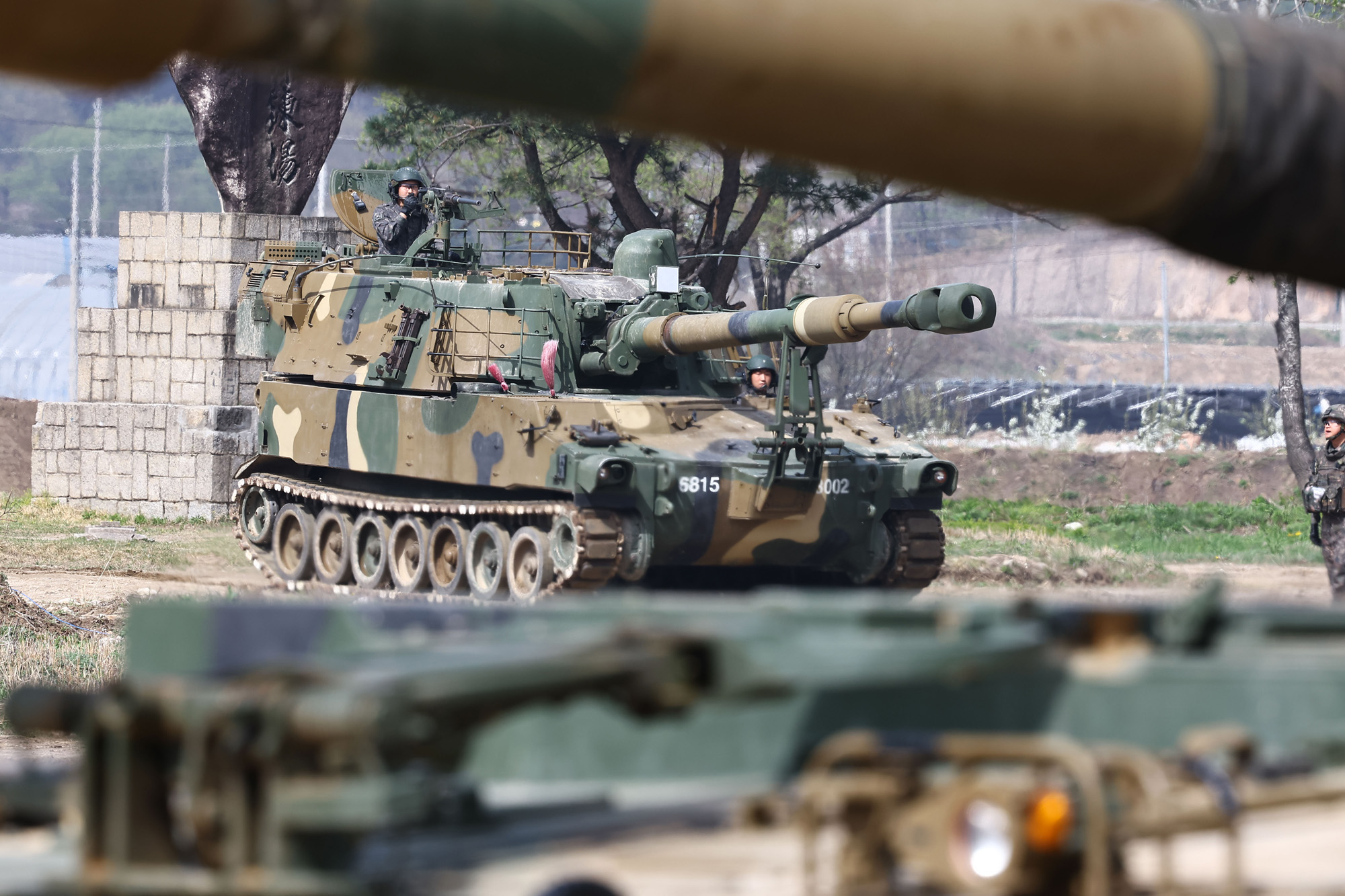 17일 강원도 철원군 문혜리사격장에서 열린 '수도군단 합동 포탄사격훈련'에서 실사격 훈련을 마친 17사단 소속 K55A1 자주포가 기동하고 있다. 2024.04.17 사진공동취재단