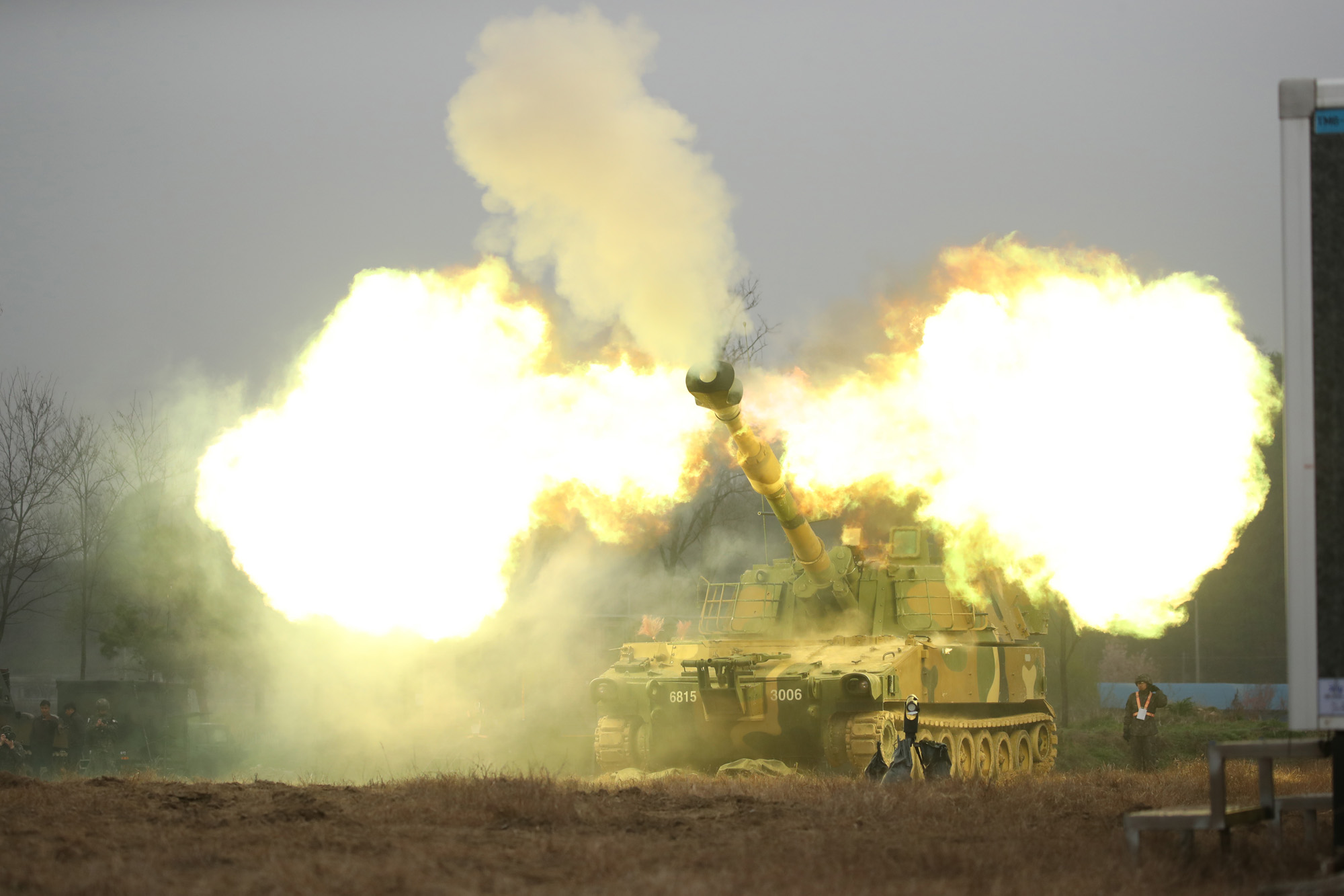 2024. 4. 17 오전 강원도 철원군 문혜리사격장에서 수도포병여단, 17사단, 해병2사단이 합동 포탄사격 훈련을 실시하고 있다. K55A1 자주포가 사격을 하고 있다. / 사진공동취재단