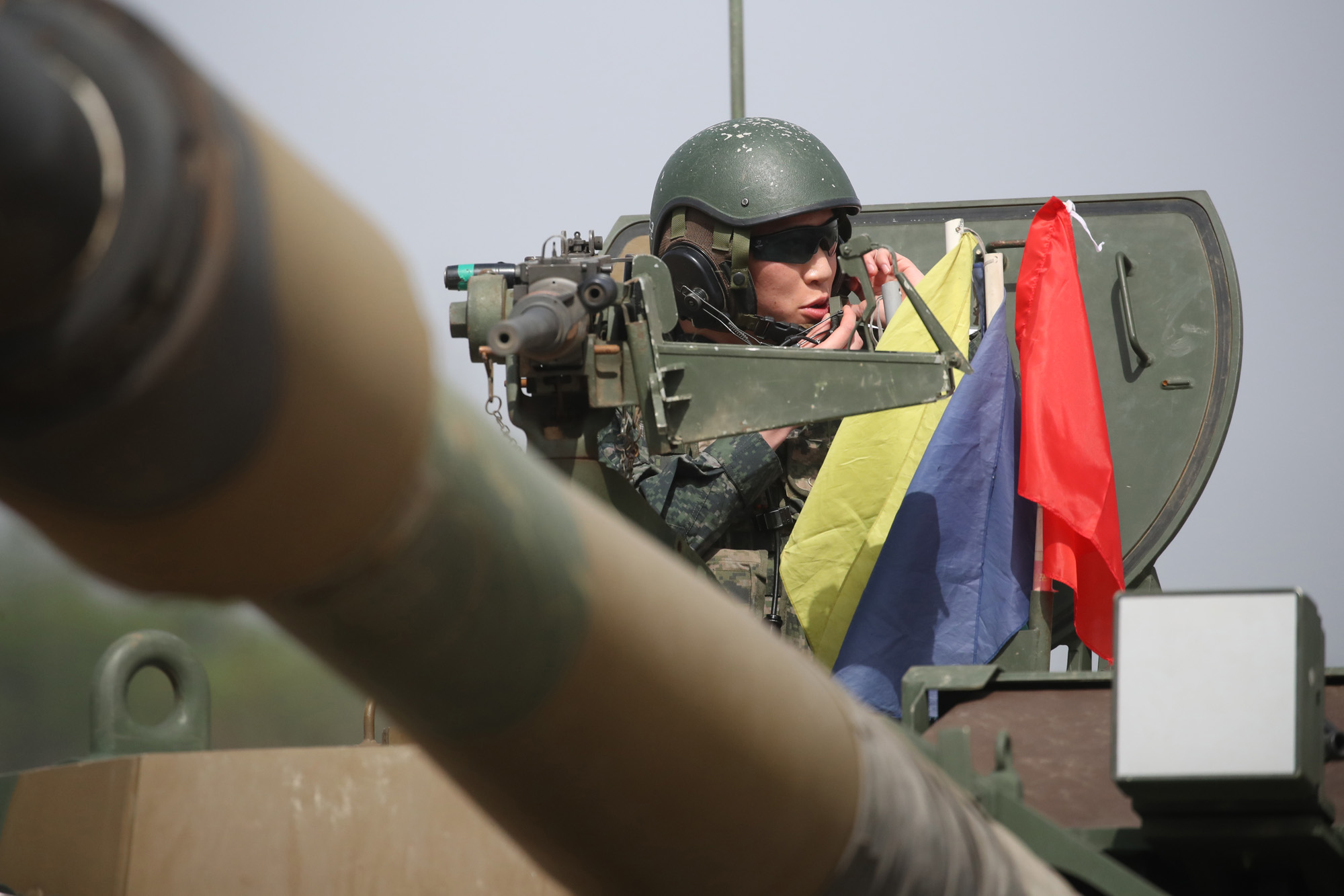 2024. 4. 17 오전 강원도 철원군 문혜리사격장에서 수도포병여단, 17사단, 해병2사단이 K9, K55A1 합동 포탄사격 훈련이 열리면서 K9 자주포에 탑승한 한 군인이 무전을 하고 있다. / 사진공동취재단