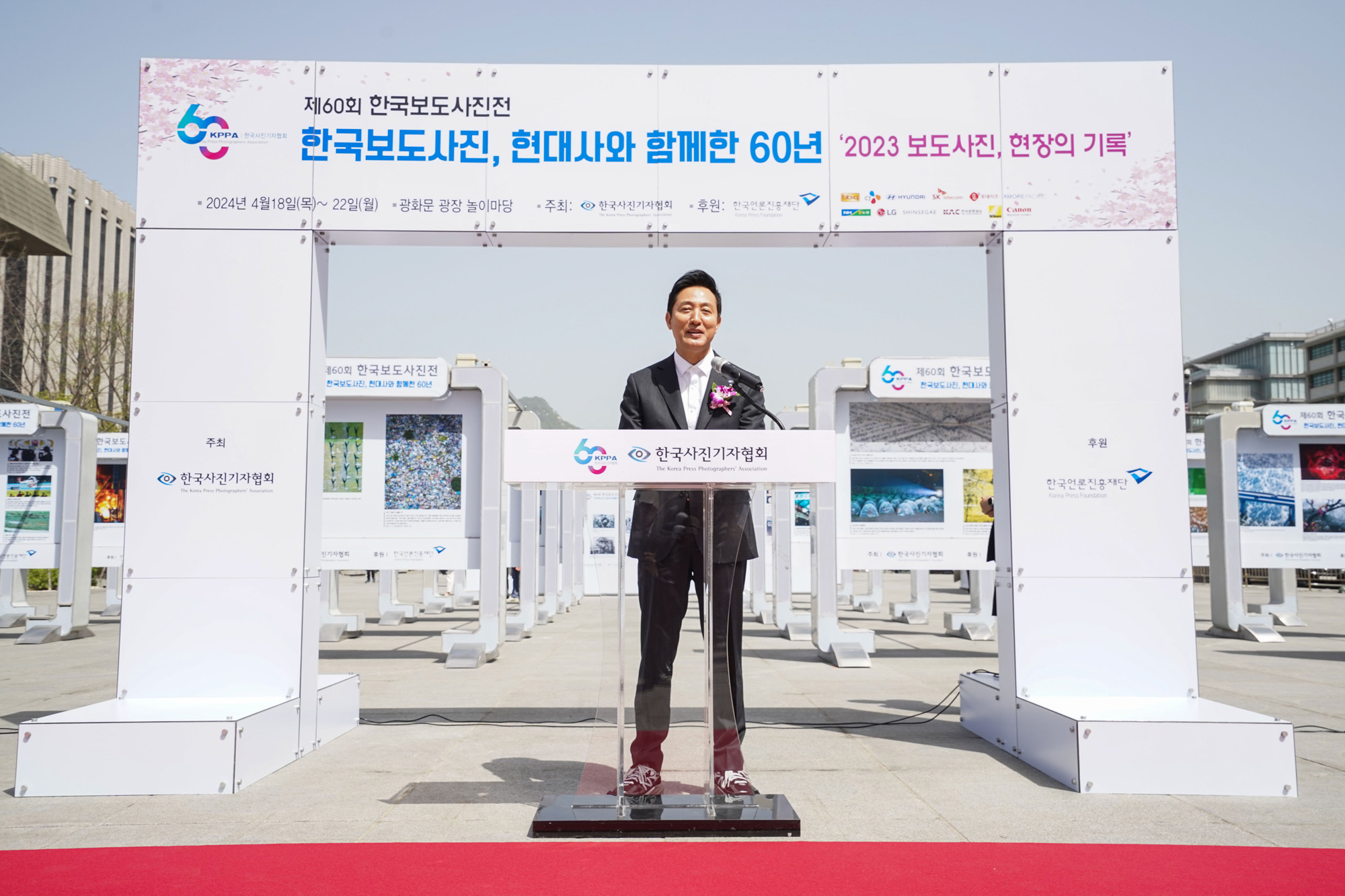 오세훈 서울시장이 18일 서울 종로구 광화문광장에서 열린 '제60회 한국보도사진전 개막식'에서 축사를 하고 있다. 2024.04.18 사진공동취재단