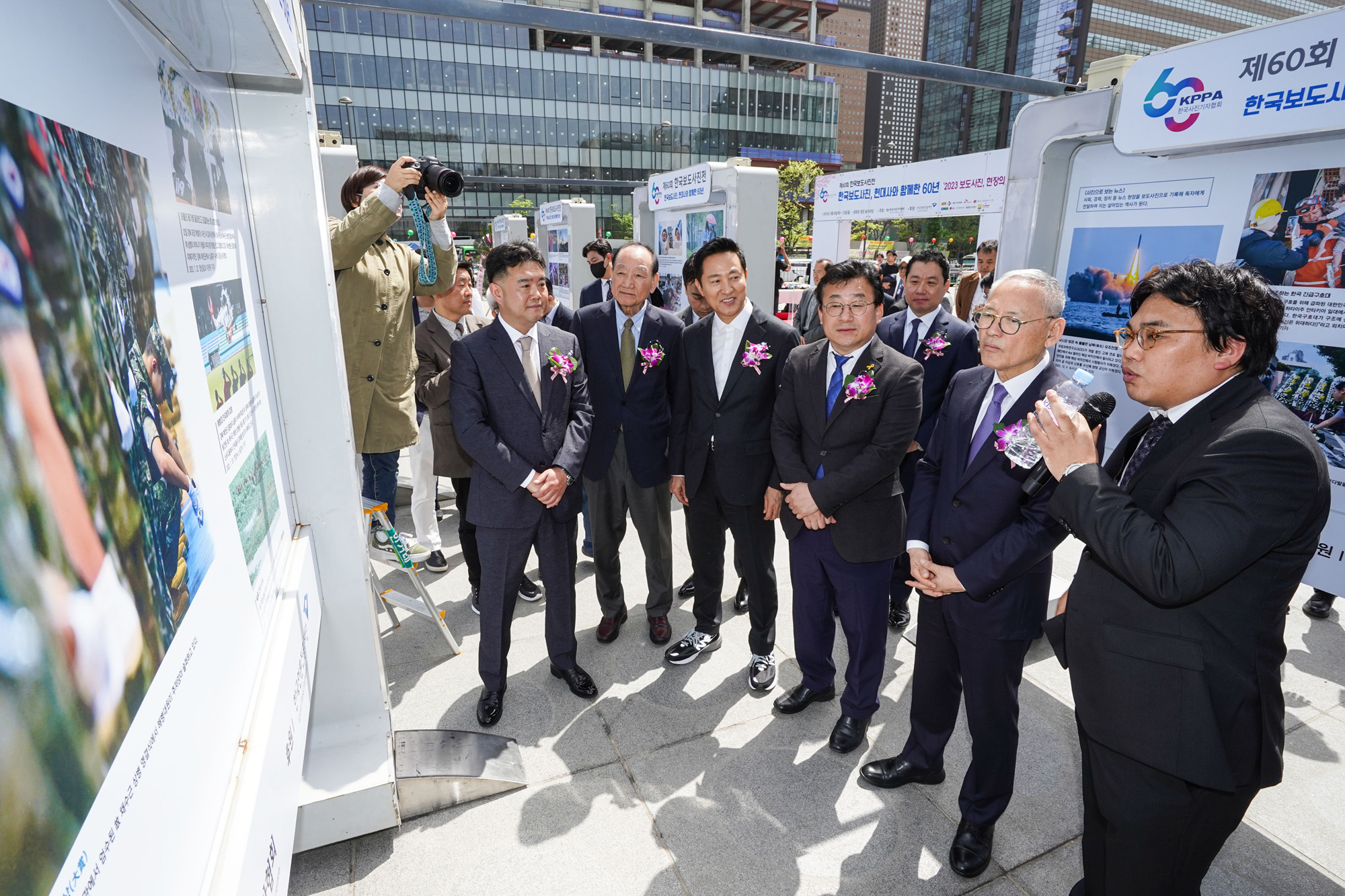 | 사진설명 | 한국보도사진상 대상 수상자인 이무열 뉴시스 기자가 18일 서울 종로구 광화문광장에서 열린 '제60회 한국보도사진전 개막식'에서 유인촌 문화체육관광부 장관(오른쪽 두 번째)을 비롯한 내빈들에게 보도사진상 대상 수상작에 대한 설명을 하고 있다. (왼쪽부터)이호재 한국사진기자협회 회장, 김효재 한국언론진흥재단 이사장, 오세훈 서울시장, 박종현 한국기자협회 회장, 유인촌 문화체육관광부 장관, 이무열 뉴시스 기자. 2024.04.18 사진공동취재단 |