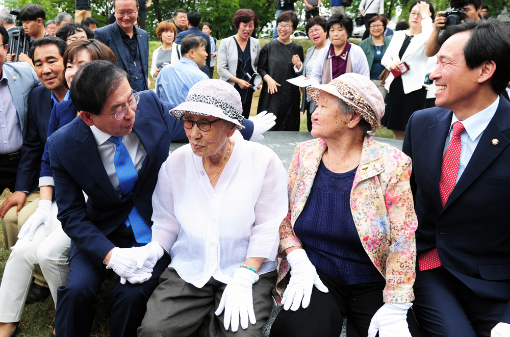 29일 오후 서울 중구 예장동 남산공원 옛 통감관저터에서 열린 일본군 위안부 '기억의 터' 제막식에서 박원순 서울시장이 발언을 하고 있다. 서울시 제공