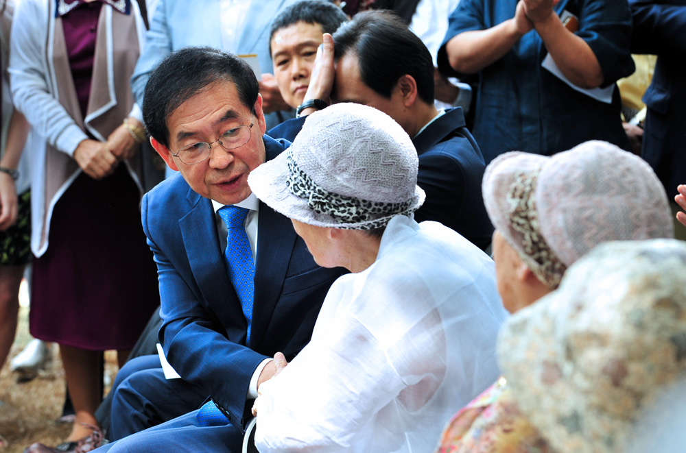 29일 오후 서울 중구 예장동 남산공원 옛 통감관저터에서 열린 일본군 위안부 '기억의 터' 제막식에서 박원순 서울시장이 발언을 하고 있다. 서울시 제공