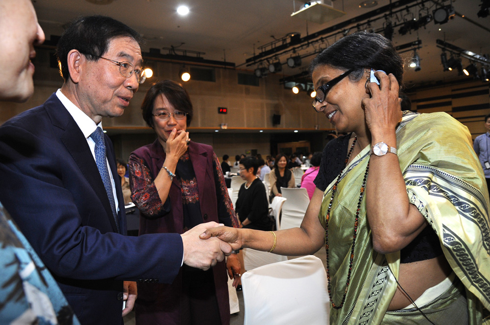 박원순 서울시장이 1일 서울여성플라자 국제회의장에서 열린 ‘제2회 아시아여성 네트워크포럼’에서 기조연설을 하고 있다. 서울시 제공