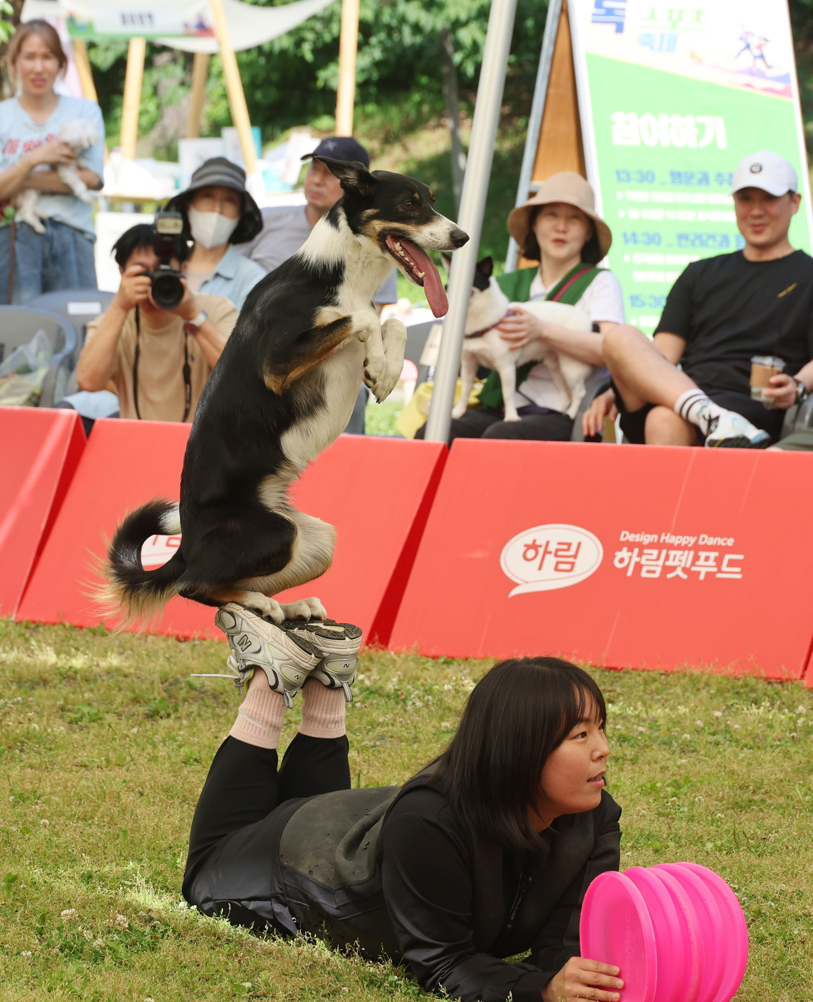 18일 서울 서초구 서초문화예술공원 야외무대에서 열린 '2024 서초 독 스포츠 축제'에서 음악에 맞춰 원반을 던지며 반려견과 호흡하는 '독 디스크 대회'가 진행되고 있다. 2024.05.18 사진공동취재단