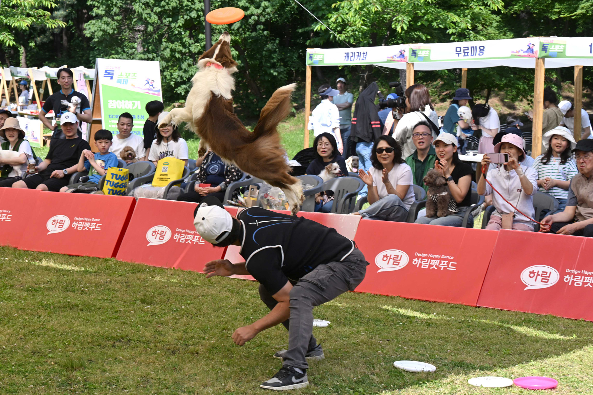 반려인과 반려견이 18일 오후 서울 서초구 서초문화예술공원 야외무대에서 열린 2024 서초 독 스포츠 축제 '독 디스크(프리스타일 분야)'에서 원반던지기 시범을 펼치고 있다. 2024.05.18. 사진공동취재단