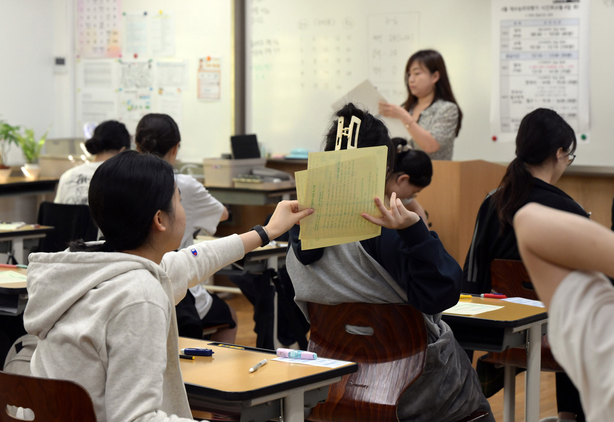 2025학년도 대학수학능력시험 6월 모의평가가 열린 4일 서울 여의도여자고등학교에서 고등학교 3학년 수험생들이 1교시 국어 영역 시험 답안지를 배부받고 있다.