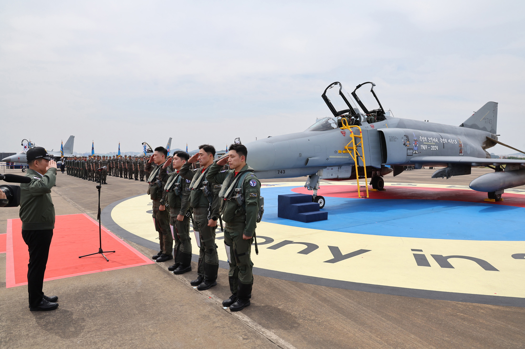 7일 경기도 수원시 공군10전투비행단에서 열린 F-4 팬텀(Phantom) 퇴역식에서 마지막 비행임무를 마친 F-4E 팬텀 전투기 조종사들이 신원식 국방부 장관에게 임무종료보고를 하며 거수경례를 하고 있다.<2024. 06. 07 사진공동취재단>