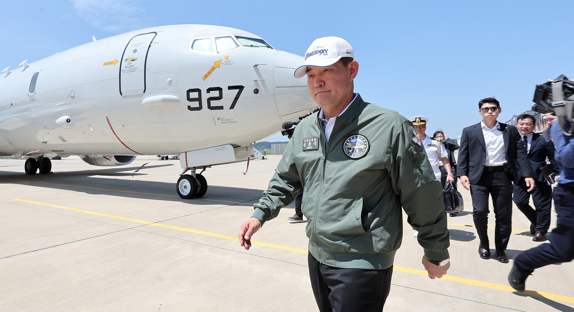 신원식 국방부 장관이 4일 경북 포항시 해군항공사령부에서 열린 해상초계기(P-8A) 국내 인수식에서 기념촬영을 위해 이동하고 있다. 2024.07.04 사진공동취재단