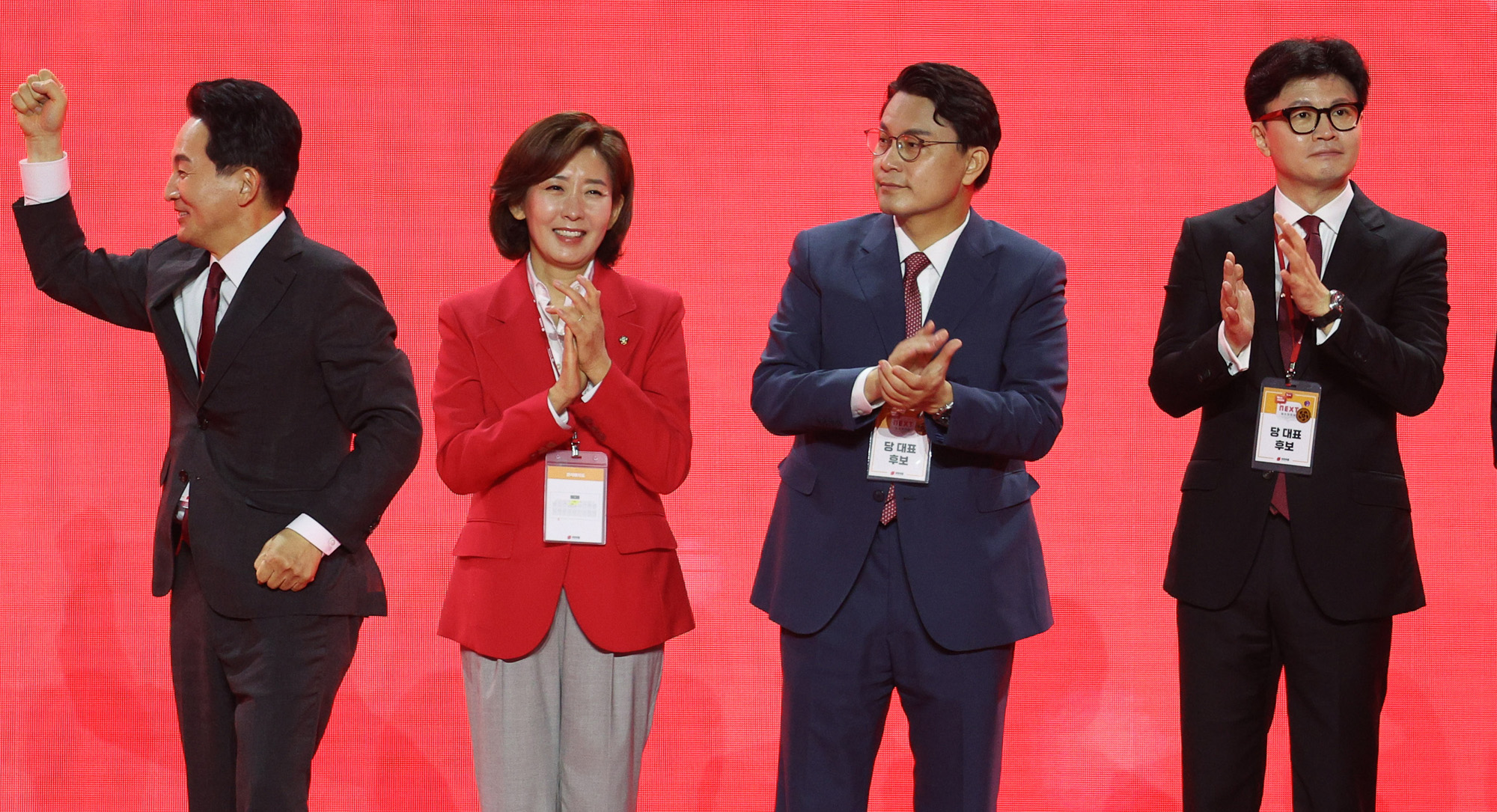국민의힘 당 대표 등을 뽑는 제4차 전당대회가 23일 오후 경기 고양시 일산서구 킨텍스에서 열려 원희룡, 나경원, 윤상현, 한동훈 당 대표 후보 등이 무대 위에 올라 인사하고 있다. 김정효 기자 hyopd@hani.co.kr