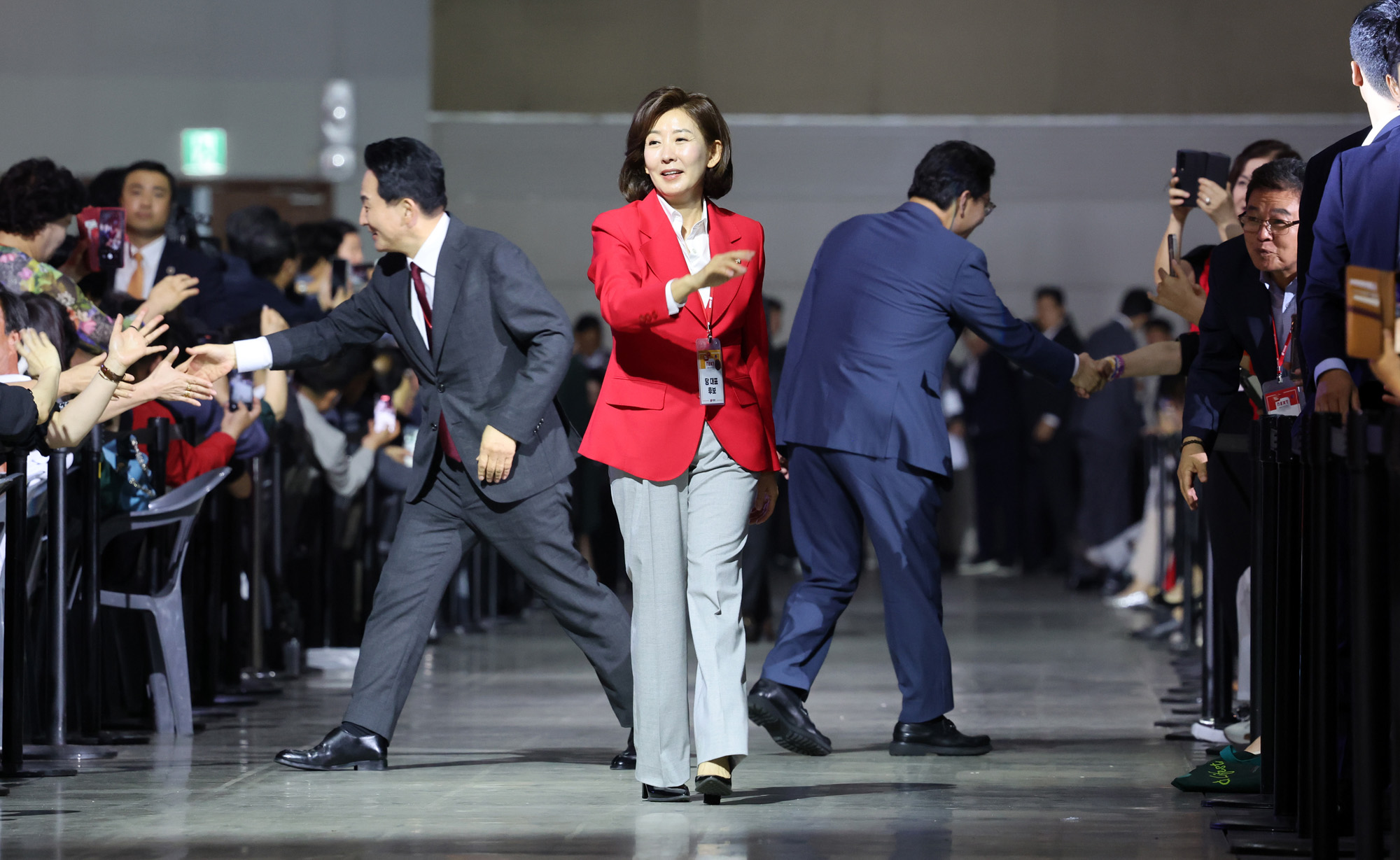 23일 경기 고양 킨텍스에서 열린 국민의힘 제4차 전당대회에서 나경원, 원희룡, 윤상현 당대표 후보가 입장하고 있다.