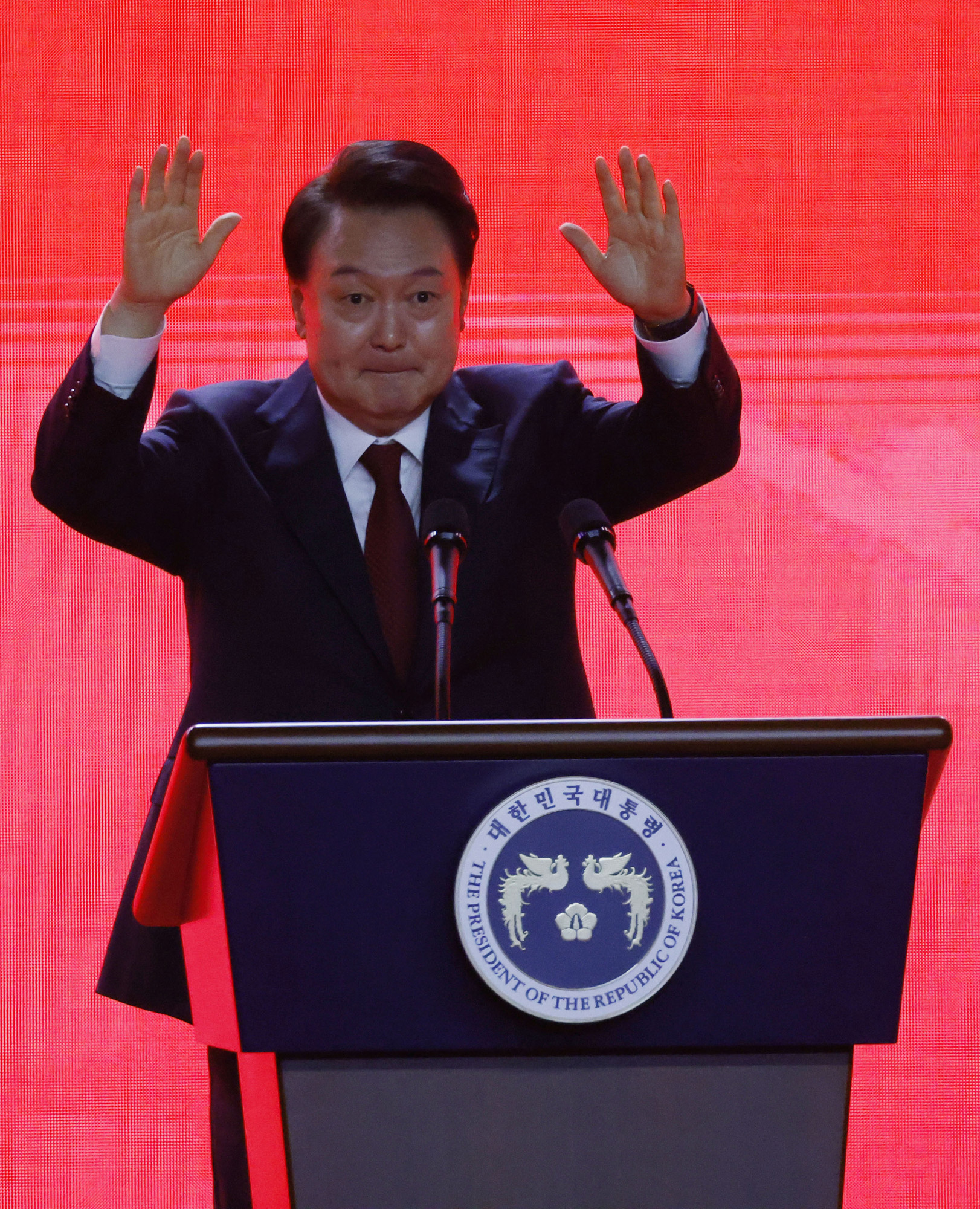 윤석열 대통령이 23일 경기 고양 킨텍스에서 열린 국민의힘 제4차 전당대회에 축사를하고 있다.