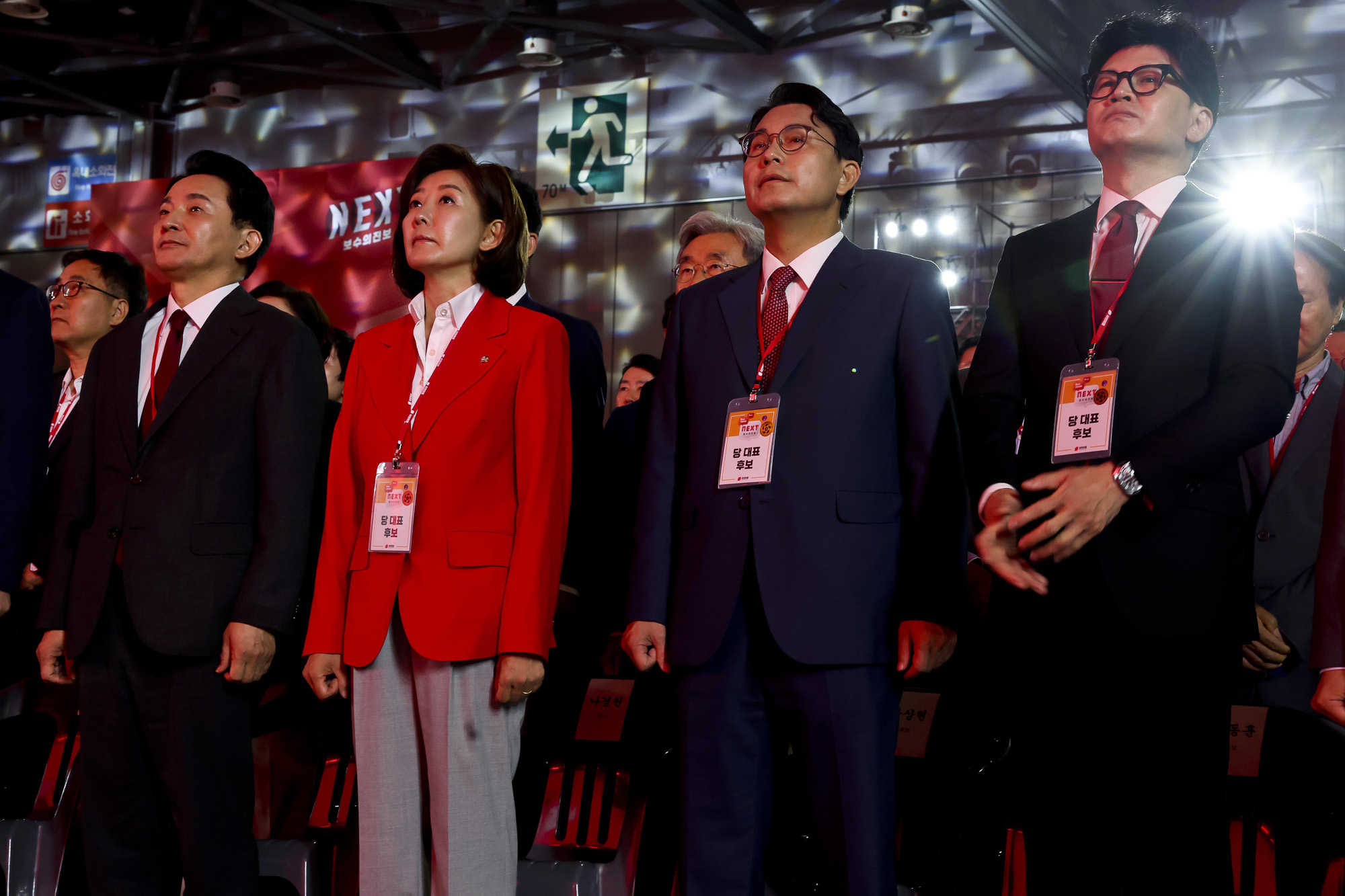 국민의힘 원희룡(왼쪽부터), 나경원, 윤상현, 한동훈 당 대표 후보가 23일 경기 고양시 킨텍스에서 열린 제4차 전당대회에 참석해 있다.