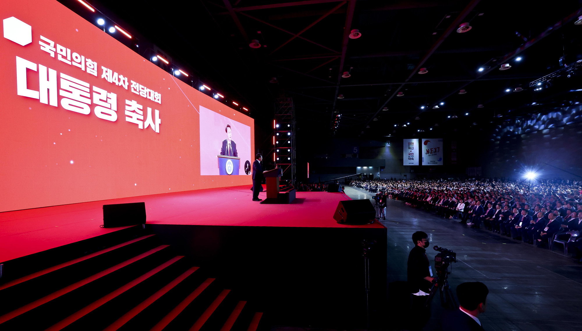 윤석열 대통령이 23일 경기 고양시 킨텍스에서 열린 국민의힘 제4차 전당대회에서 축사를 하고 있다.