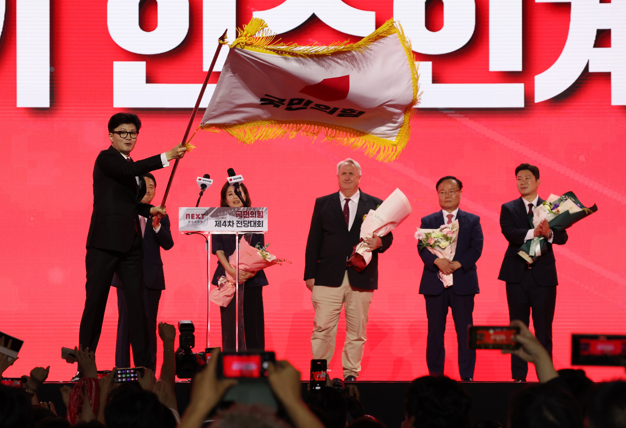 한동훈 국민의힘 당대표가 23일 경기 고양시 킨텍스에서 열린 제4차 국민의힘 전당대회에서 당대표에 선출된 후 당기를 이양받아 흔들고 있다. 2024.07.23.