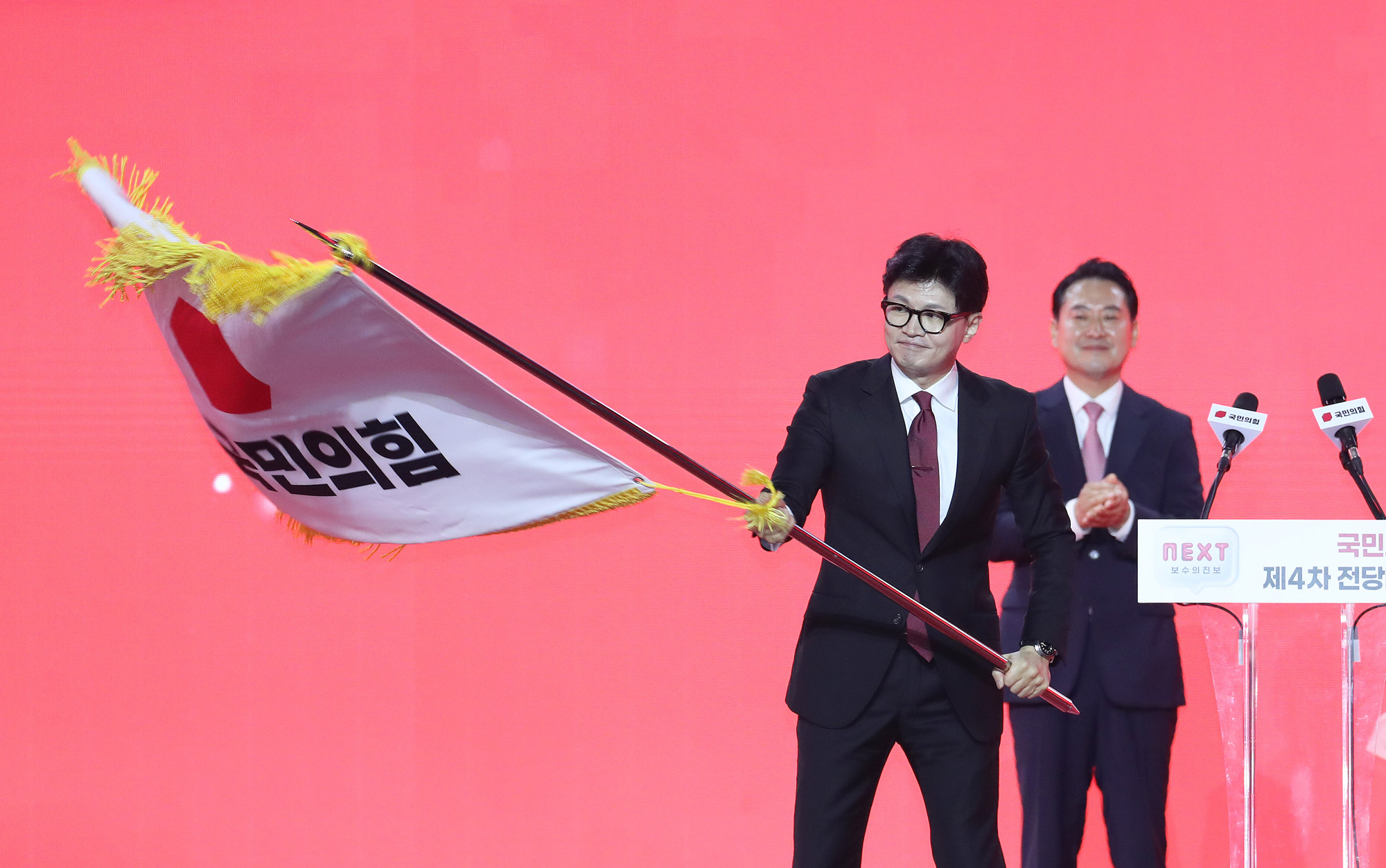 한동훈 국민의힘 신임 당대표가 23일 오후 경기 고양시 킨텍스에서 열린 국민의힘 제4차 전당대회에서 당기를 흔들고 있다. 2024.7.23