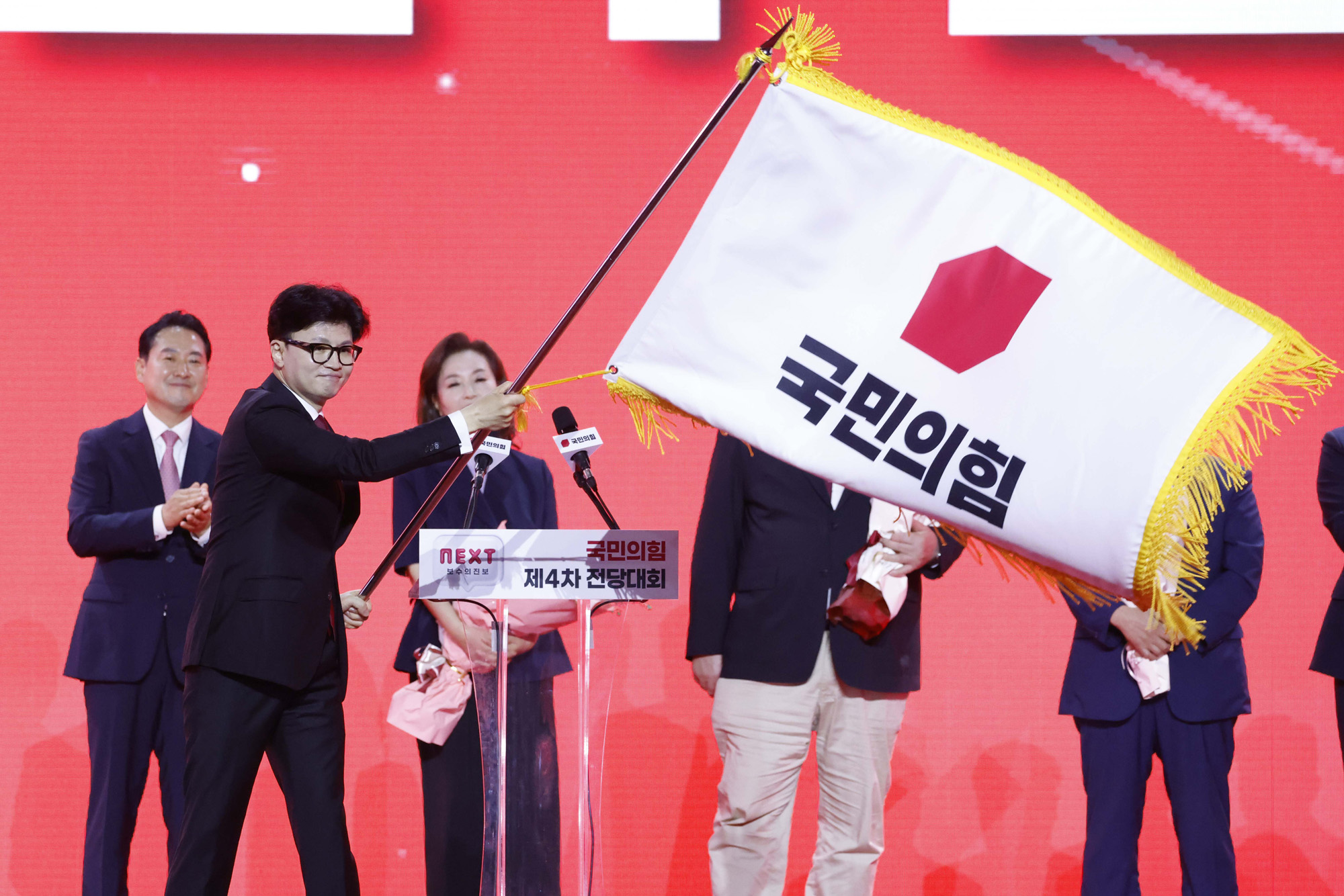 한동훈 국민의힘 신임 당대표가 23일 경기 고양 킨텍스에서 열린 국민의힘 제4차 전당대회에서 당기를 흔들고 있다.