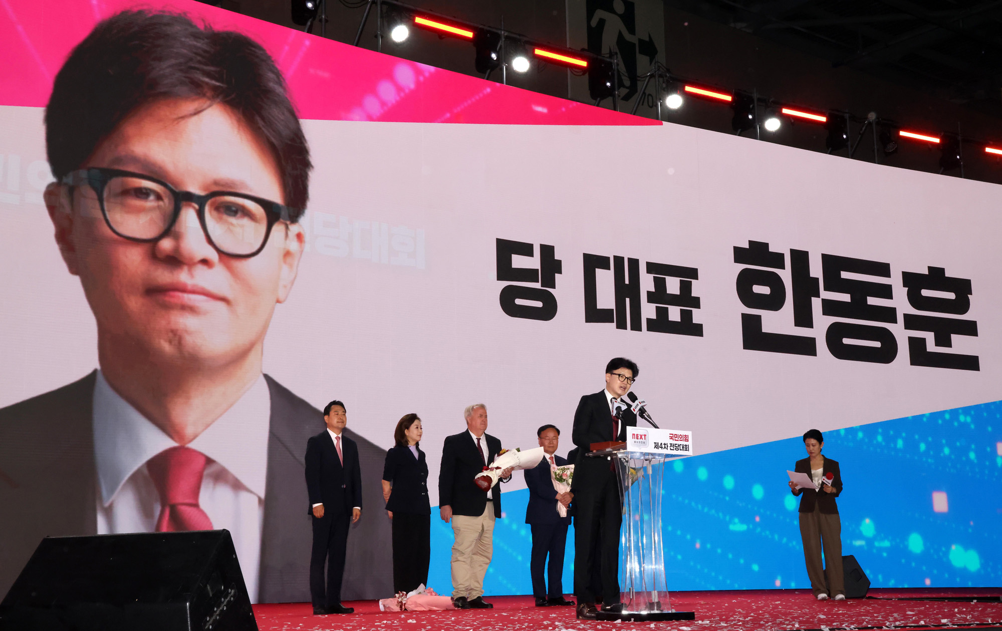 한동훈 국민의힘 당대표 당선자가 23일 경기 고양시 킨텍스에서 열린 국민의힘 제4차 전당대회에서 수락연설을 하고 있다.