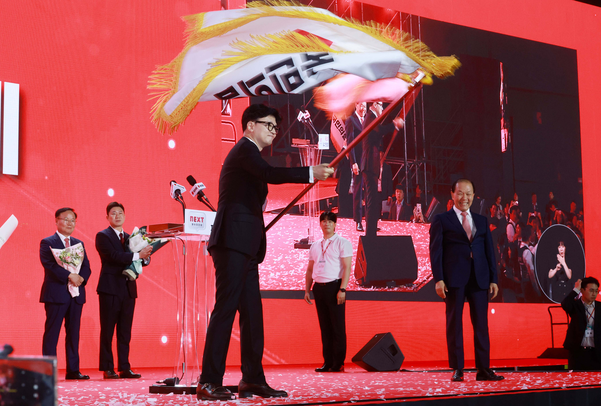 한동훈 국민의힘 당대표 당선자가 23일 경기 고양시 킨텍스에서 열린 국민의힘 제4차 전당대회에서 황우여 비상대책위원장으로부터 당기를 전달받아 흔들고 있다.