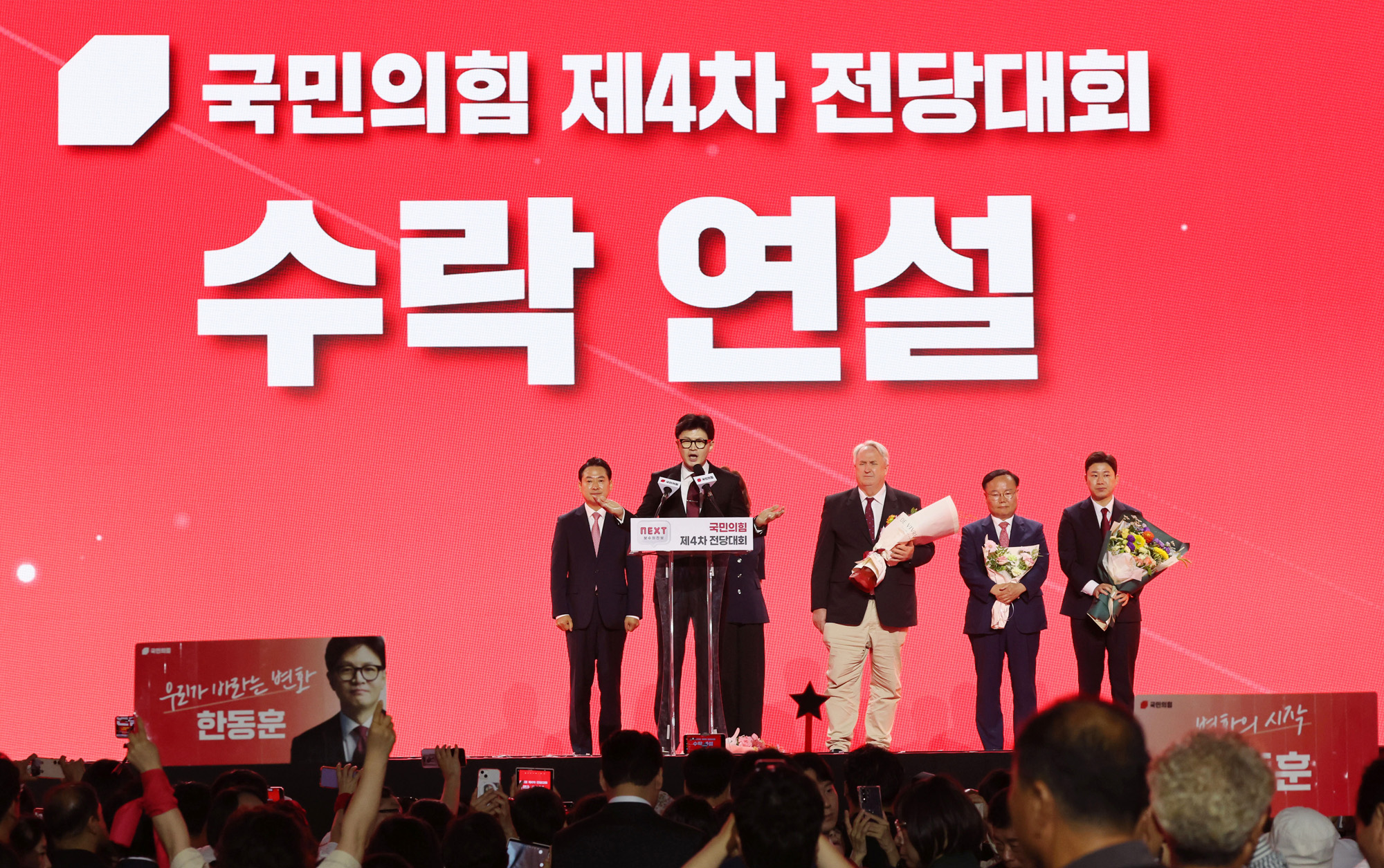 한동훈 국민의힘 신임 대표가 23일 오후 경기 고양시 킨텍스에서 열린 국민의힘 제4차 전당대회에서 당대표 수락연설을 하고 있다.