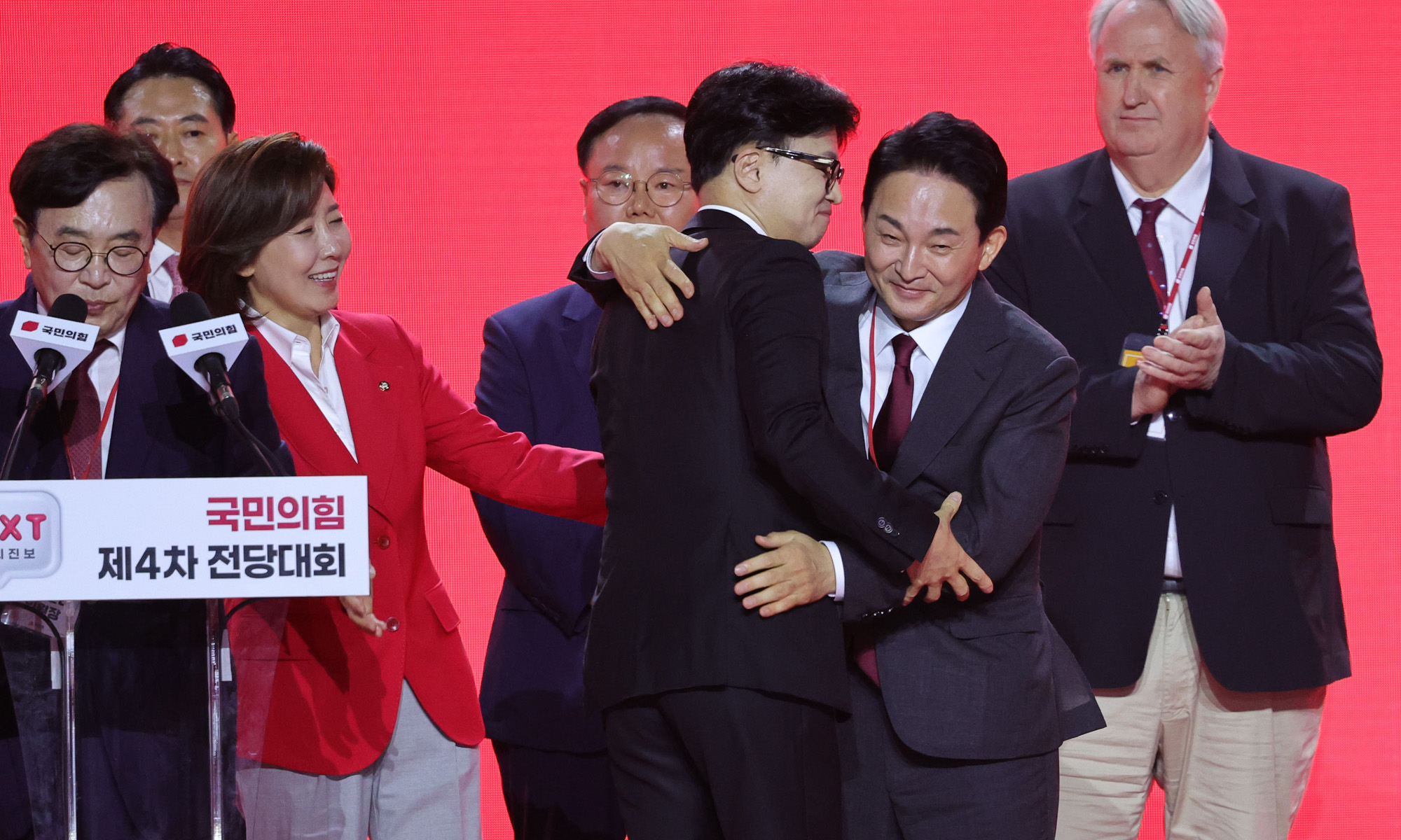 국민의힘 당대표로 선출된 한동훈 후보가 23일 전당대회에서 발표직후 나경원, 원희룡 후보와 포옹하고 있다. / 240723