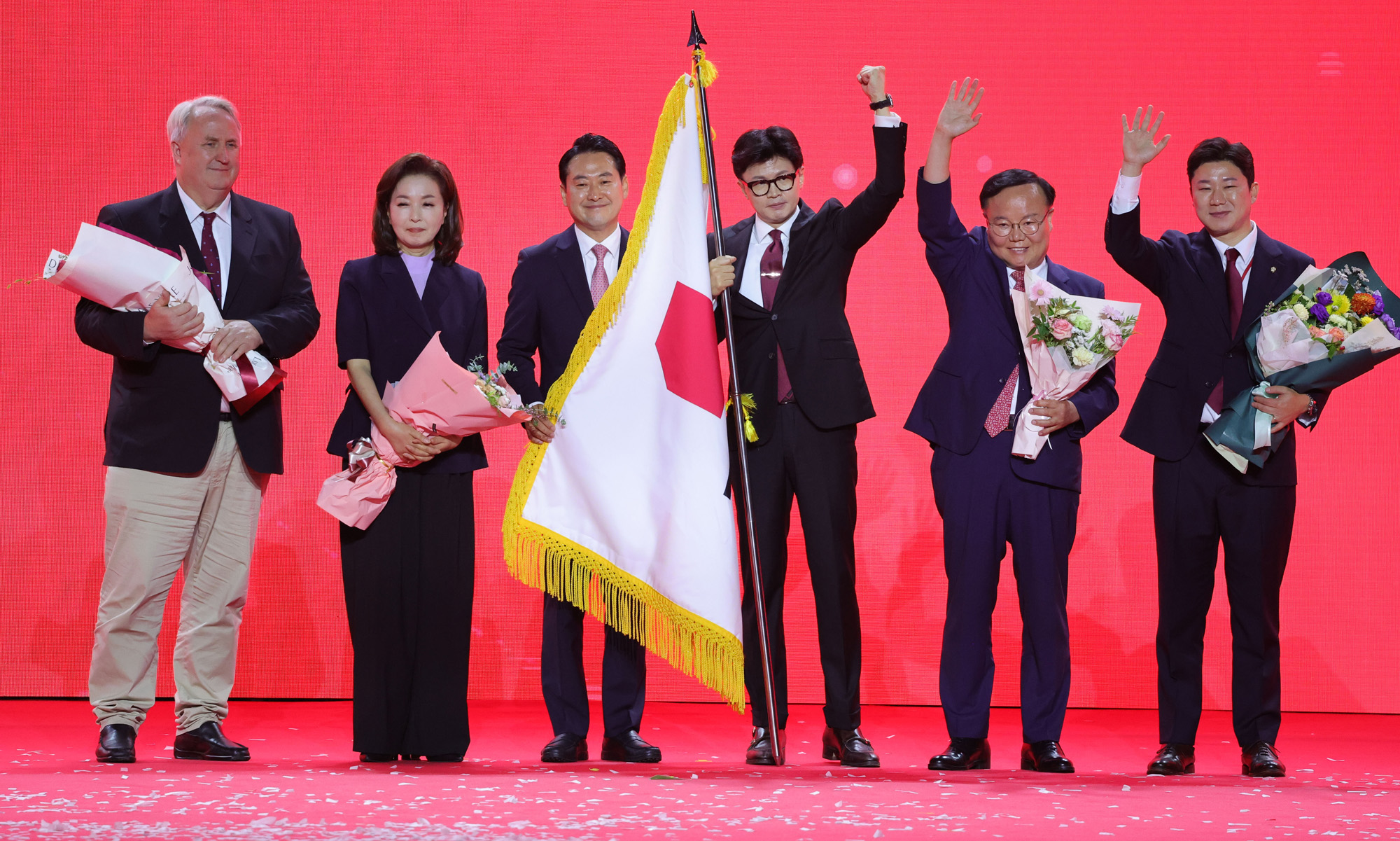 한동훈 국민의힘 신임 당대표가 23일 경기도 고양 킨텍스에서 열린 전당대회에서 신임 지도부와 기념촬영하고 있다. / 240723