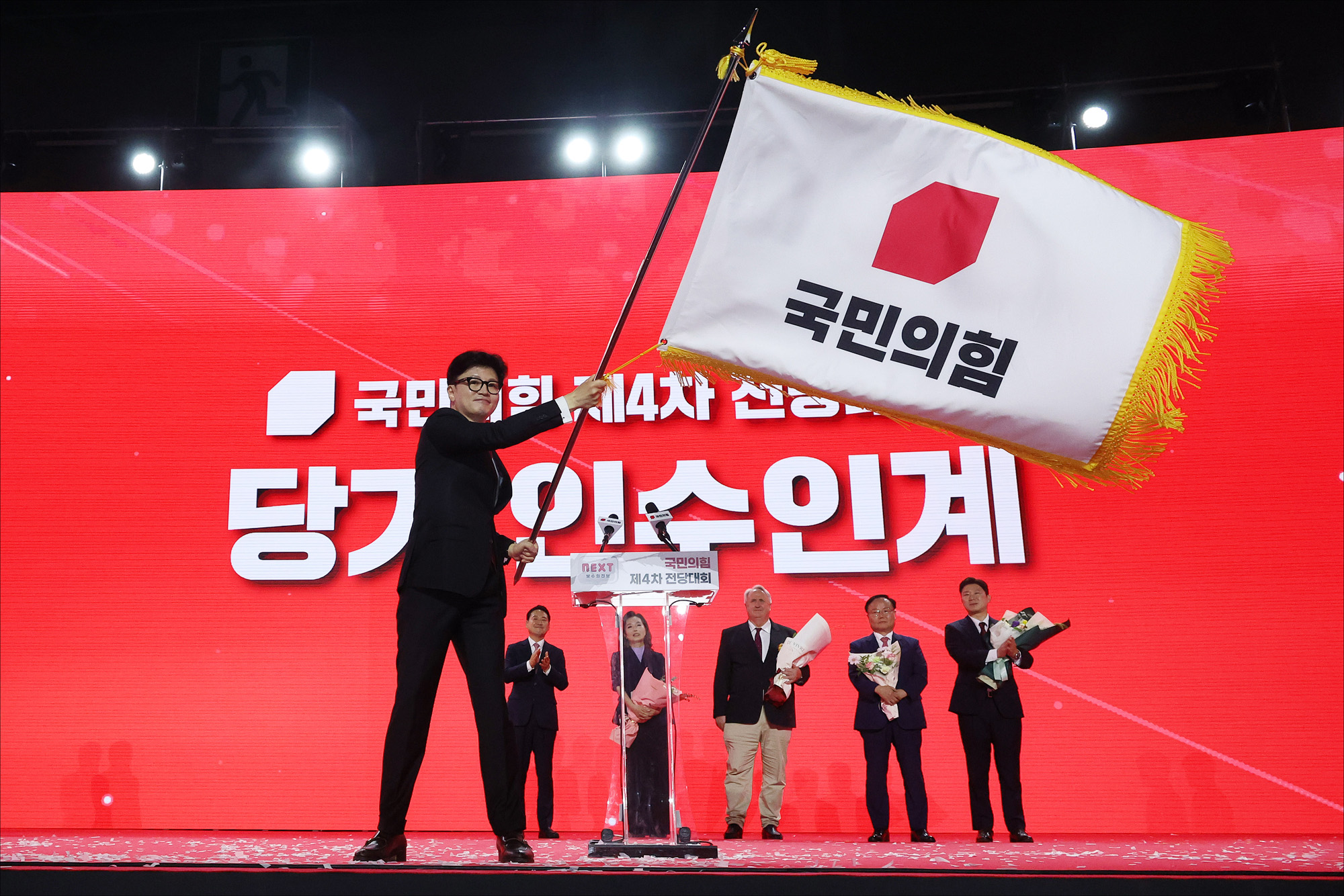 한동훈 국민의힘 신임 당대표가 23일 오후 경기도 고양시 킨텍스에서 열린 국민의힘 제4차 전당대회에서 국민의힘 당기를 힘차게 흔들고 있다.