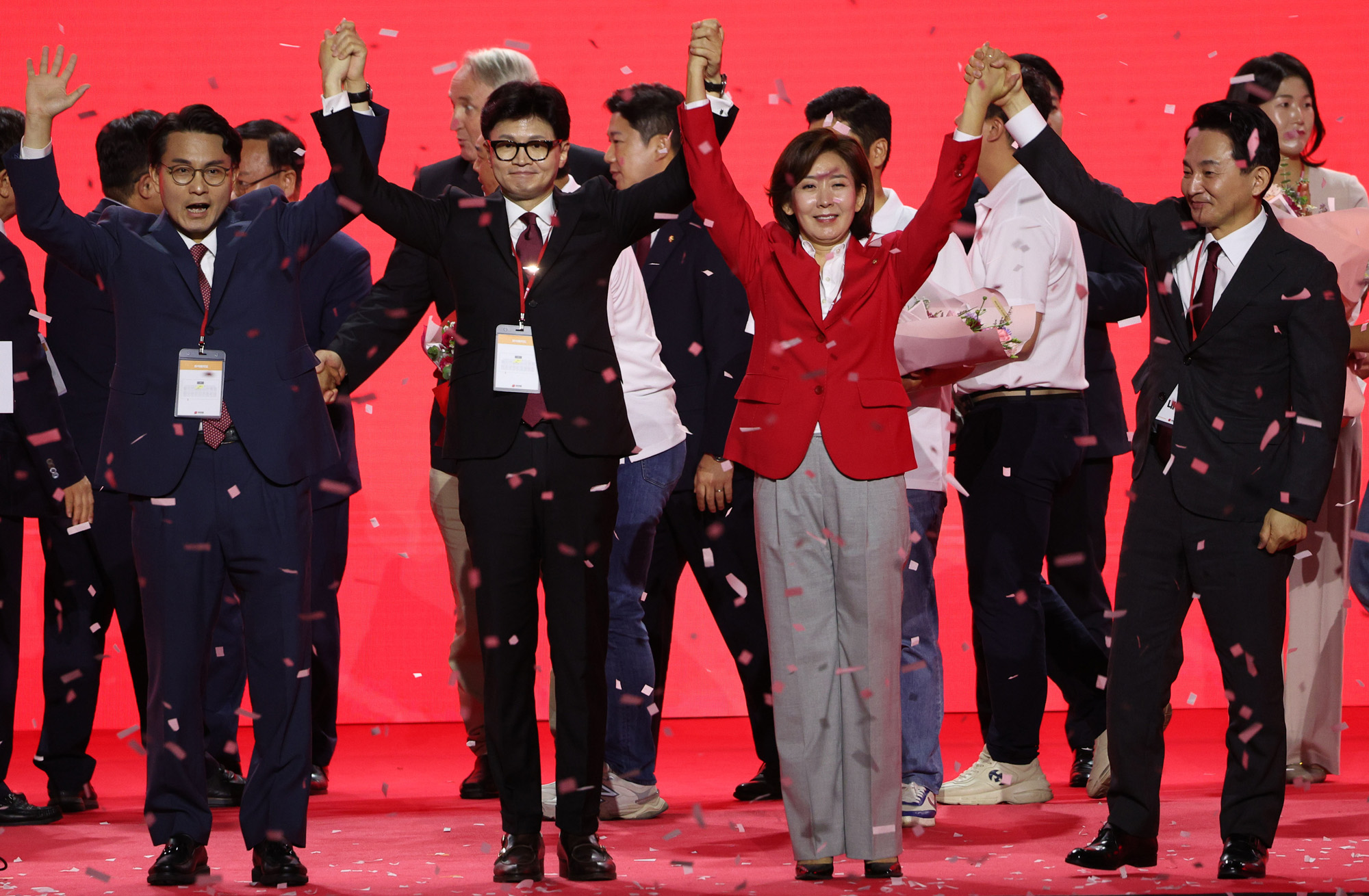 국민의힘 제4차 전당대회에서 당 대표로 뽑힌 한동훈 당선자가 23일 오후 경기 고양시 일산서구 킨텍스에서 경쟁했던 윤상현, 나경원, 원희룡 후보와 함께 손을 들어올리며 당원들에게 인사하고 있다. 김정효 기자 hyopd@hani.co.kr