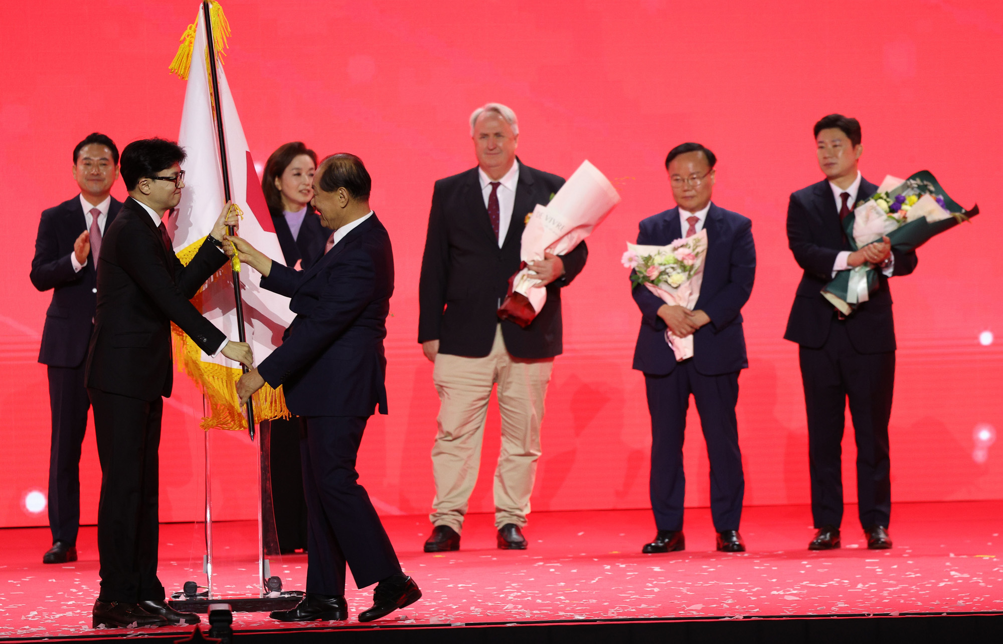 국민의힘 제4차 전당대회에서 당 대표로 뽑힌 한동훈 당선자가 23일 오후 경기 고양시 일산서구 킨텍스에서 황우여 비상대책위원장이 건네는 당기를 받고 있다. 김정효 기자 hyopd@hani.co.kr