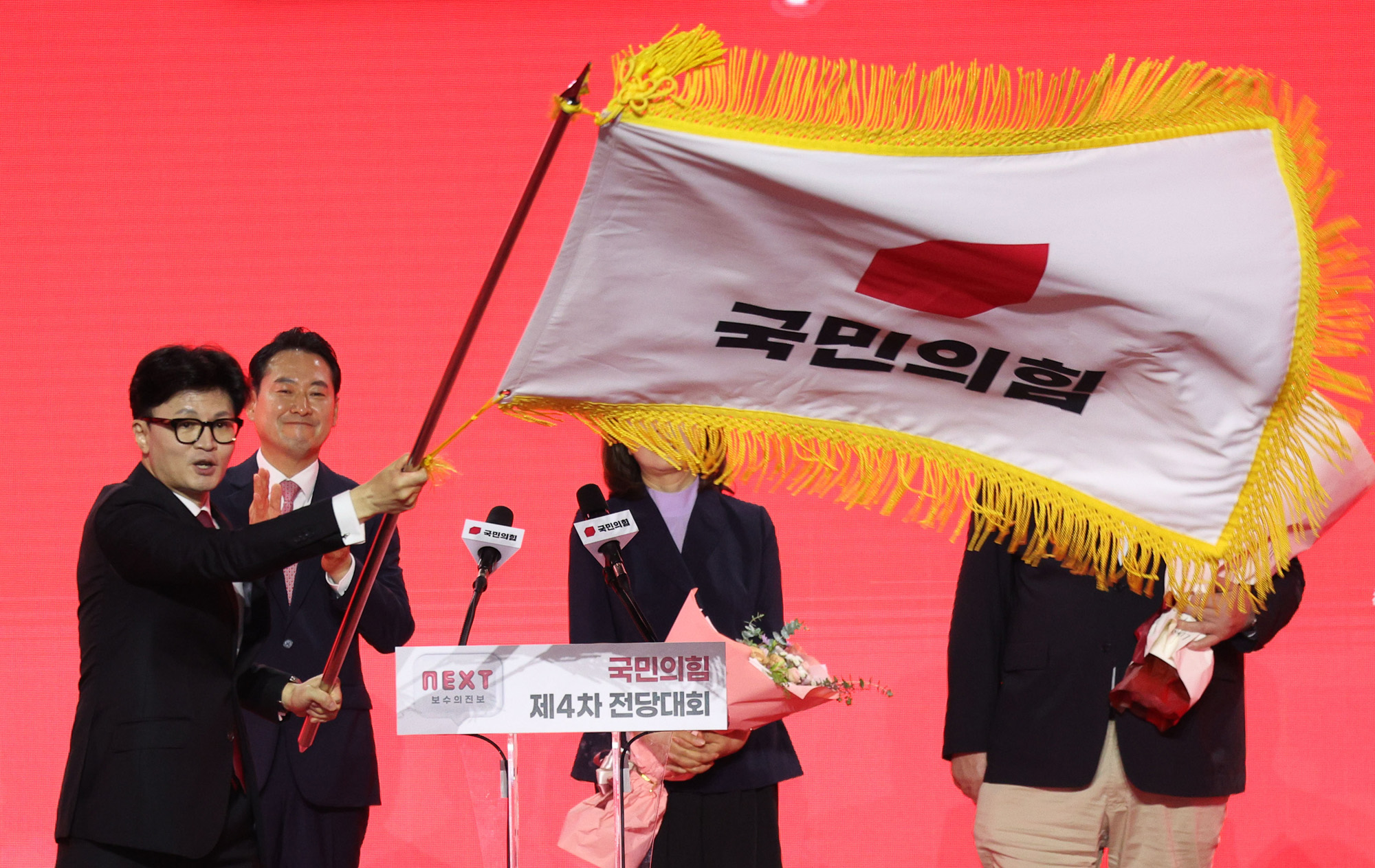 국민의힘 제4차 전당대회에서 당 대표로 뽑힌 한동훈 당선자가 23일 오후 경기 고양시 일산서구 킨텍스에서 당기를 흔들고 있다. 김정효 기자 hyopd@hani.co.kr