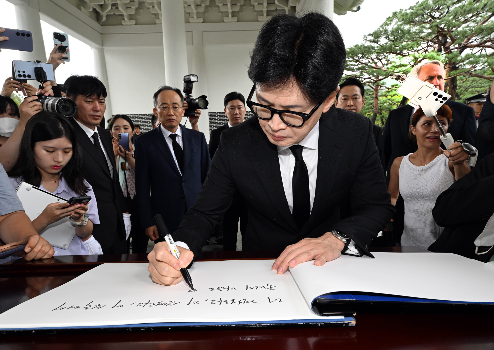 한동훈 대표를 비롯한 국민의 힘 신임 지도부 의원들이 24일 국립현충원을 참배했다. 한 대표가 참배 후 방명록에 서명하고 있다. 2024.7.24