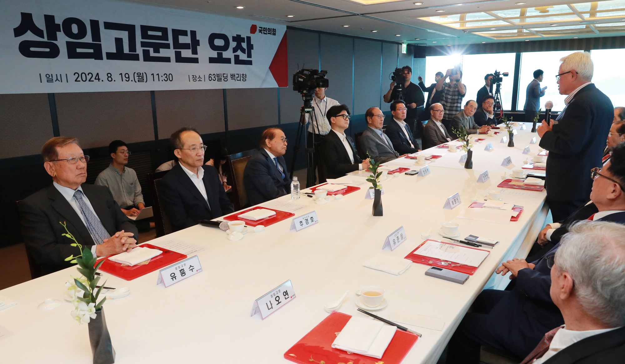 정의화 국민의힘 상임고문단 회장이 19일 오전 서울 여의도 63빌딩 백리향에서 열린 상임고문단 오찬 회의에서 인사말을 하고 있다.